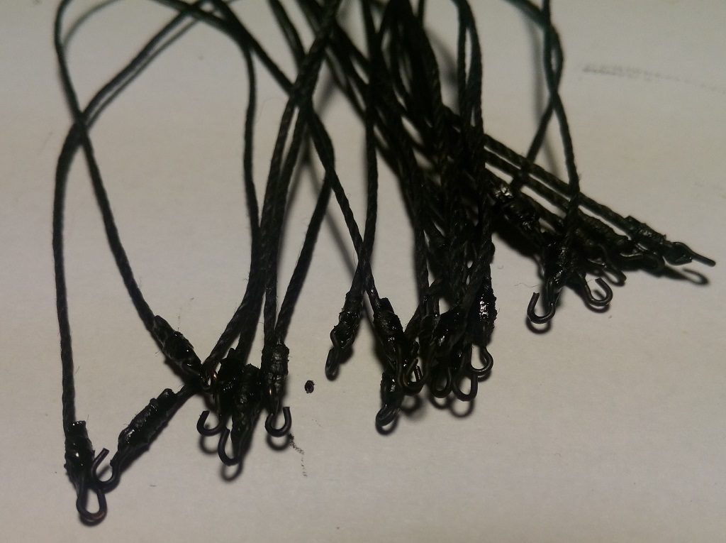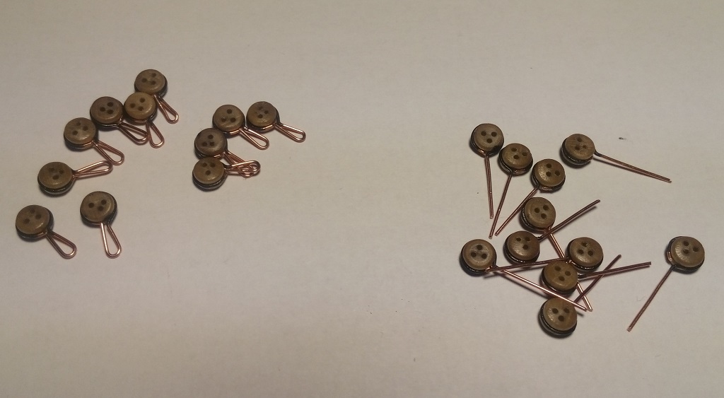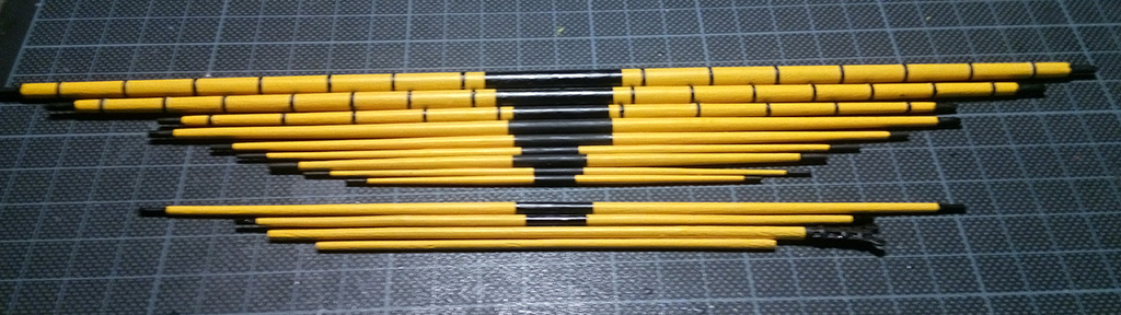 Do mocowania rej musiałem zrobić raksloty, metodą Kazimierza i @Oksala. Wykorzystałem gotowe koraliki szklane 1,5mm w kolorze brązowym - miały takie być, ale są metaliczne. Elementy dzielące zrobiłem z balsy 1mm - tylko takie drewienko miałem pod ręką. Poniżej etapy roboty: