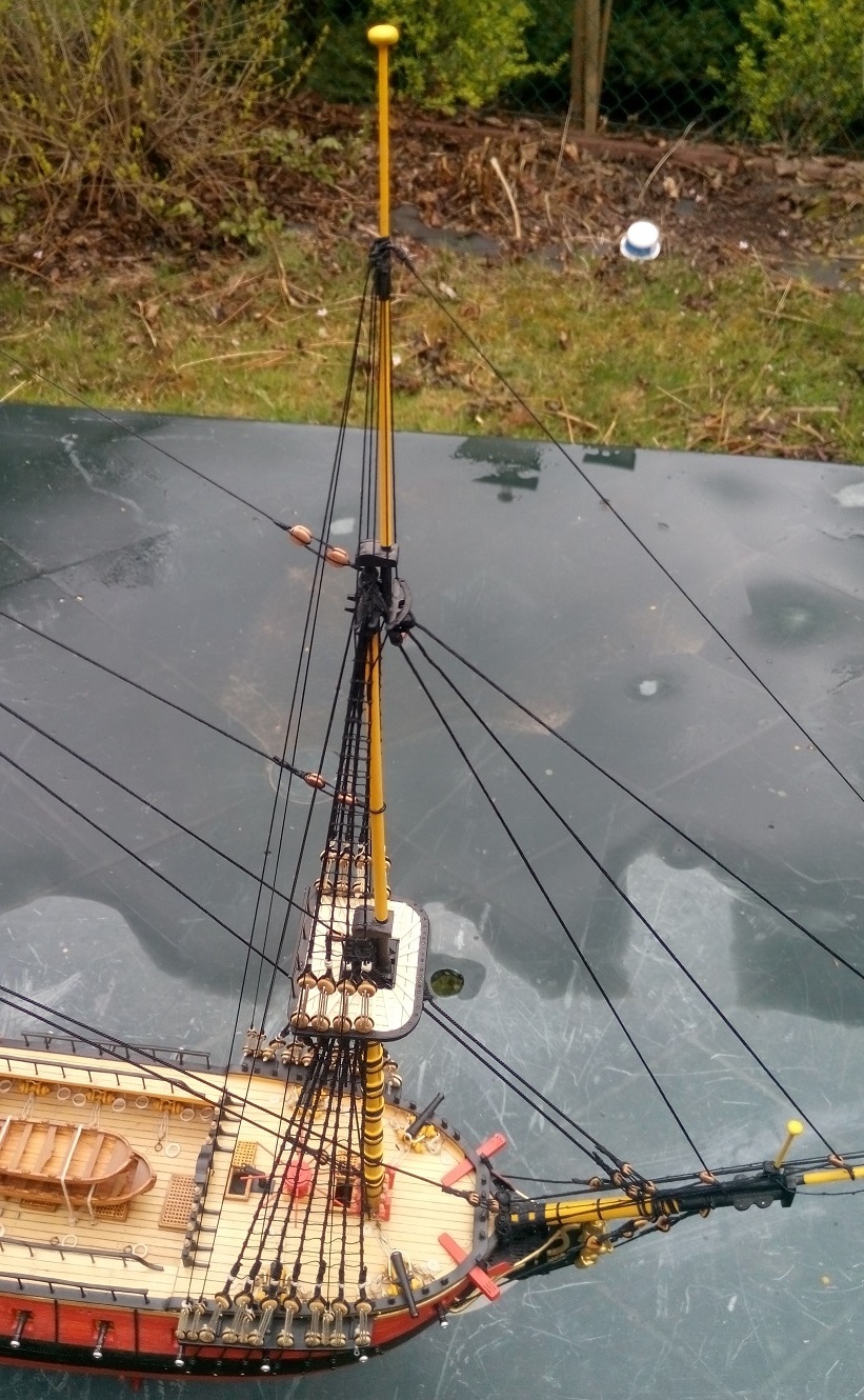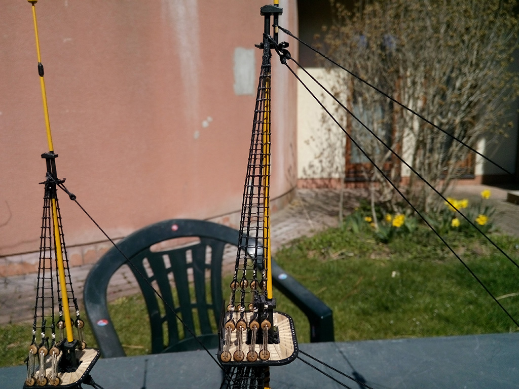 Prace cały czas postępują, chociaż są mało widoczne - musiałem zawiesić dużą liczbę bloczków na masztach, salingach i marsach, potrzebnych do mocowania rej i żagli.