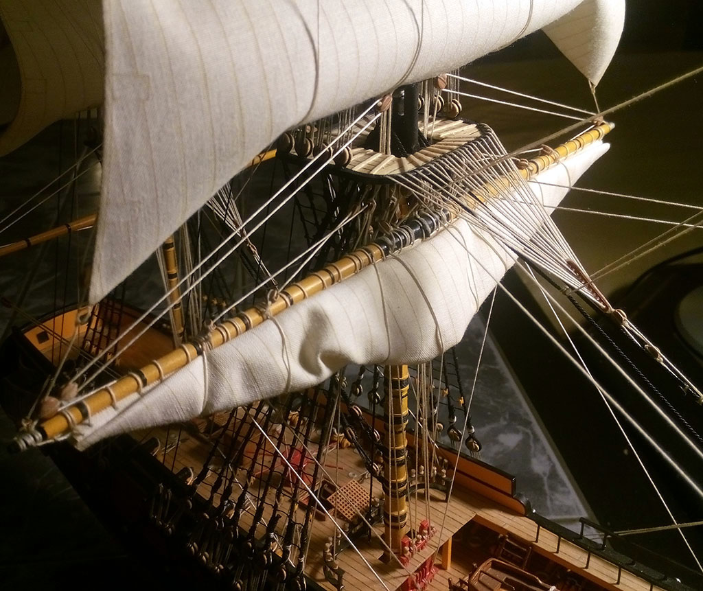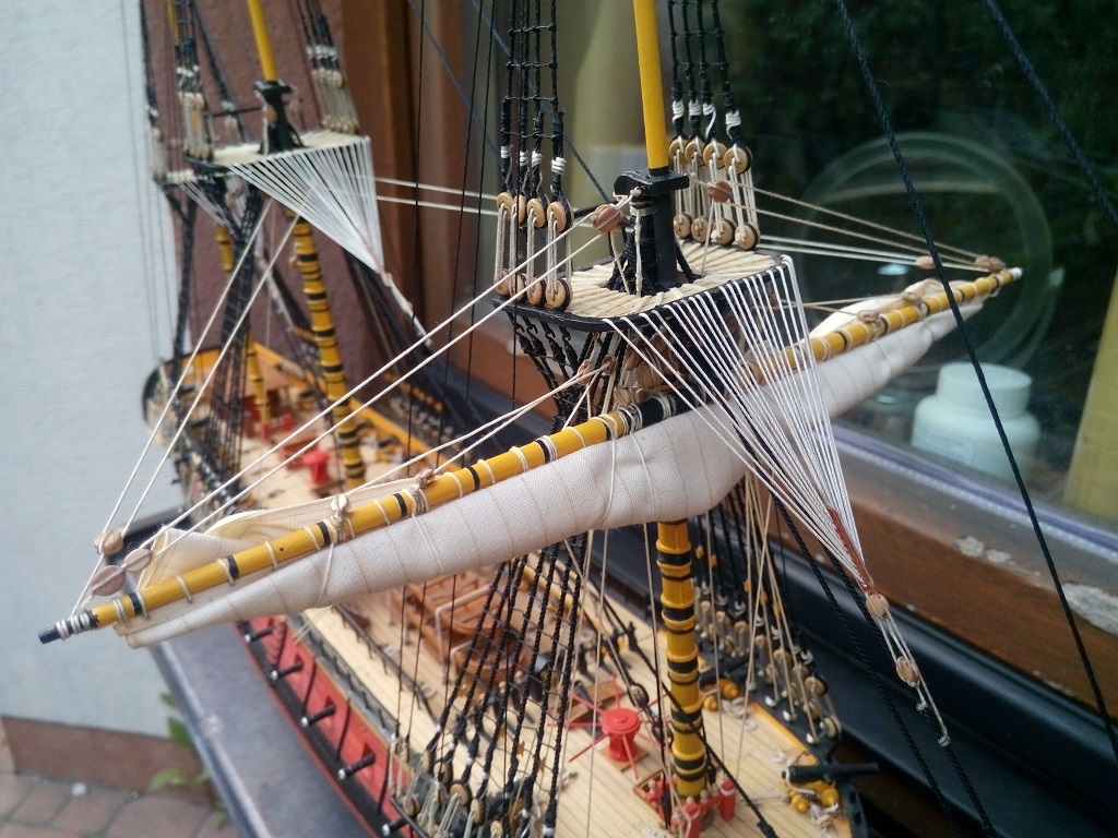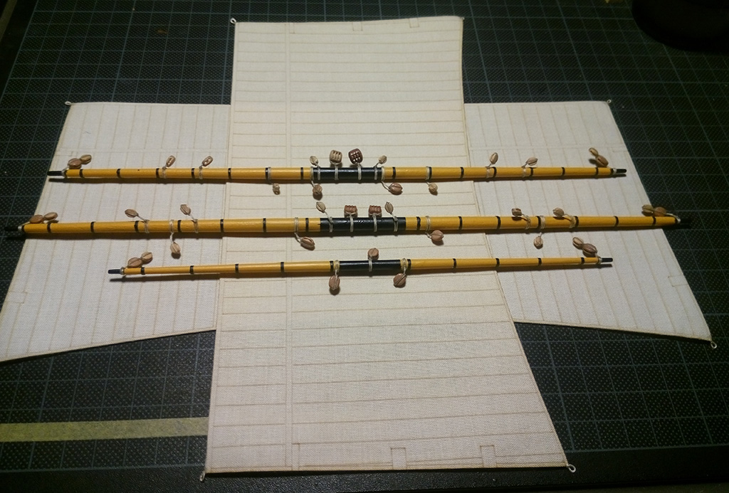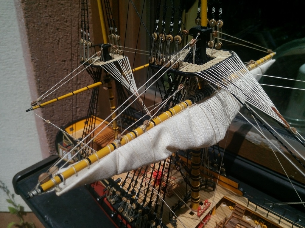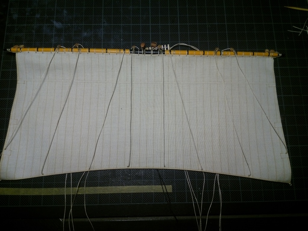 Nie jestem ekspertem w tej materii, ale gejtawa powinna być od strony wewnętrznej żagla. Natomiast gordingi mam po obu stronach żagla i nie wiem do końca czy to jest prawidłowe - w oryginale powinny jeszcze przechodzić przez oczka przymocowane do żagla.