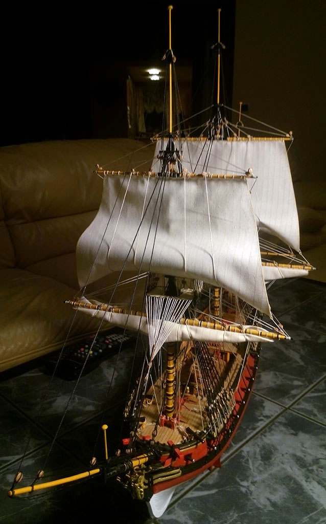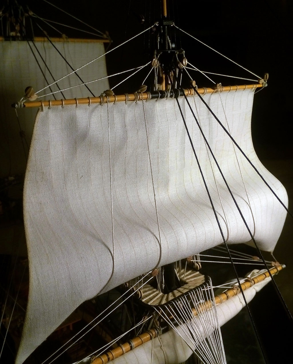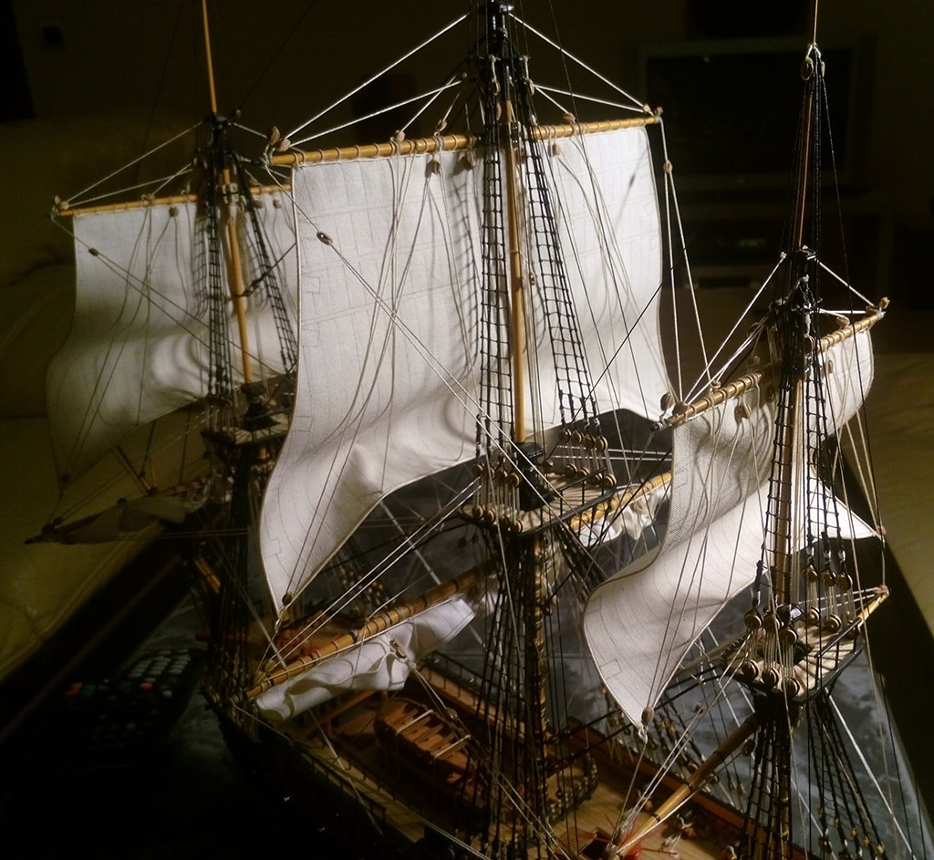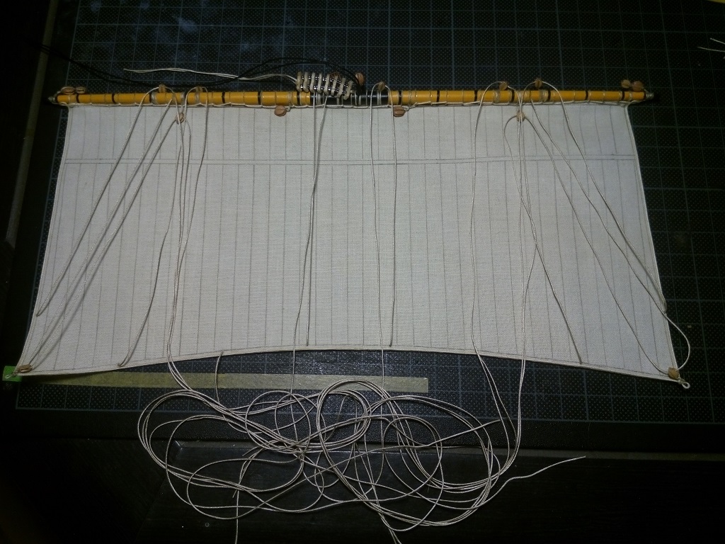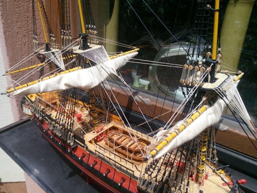 Nie jestem ekspertem w tej materii, ale gejtawa powinna być od strony wewnętrznej żagla. Natomiast gordingi mam po obu stronach żagla i nie wiem do końca czy to jest prawidłowe - w oryginale powinny jeszcze przechodzić przez oczka przymocowane do żagla.