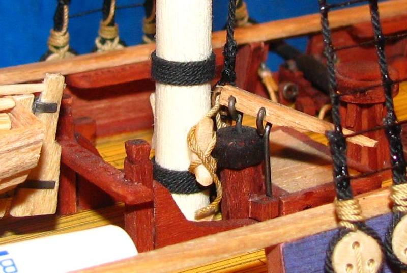 Niestety miejsca brakło nawet na cienką końcówkę pęsety - i blok, przyklejony do pokładu, musiał zostać w tej przekręconej pozycji. W wyniku tego, lina ściągacza, niestety nieładnie jest skręcona – nic na to nie poradzę. Rozwiązaniem mogłoby być wcześniejsze zamontowanie całego zblocza – bo przyklejenie samego, dolnego bloczka do pokładu powoduje całkowity brak możliwości włożenia linki w bloczek.