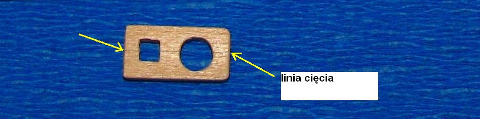Dyby zrobione są z patyka do lodów. Najpierw wywierciłem otwór na stengę, następnie przeciąłem dyby wzdłuż i iglakiem wypiłowałem prostokątny otwór. Potem skleiłem obie połówki razem i poodcinałem końcówki do ostatecznego wymiaru dyb. Po sklejeniu wygląda to tak.