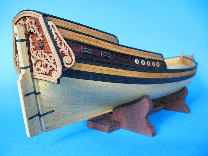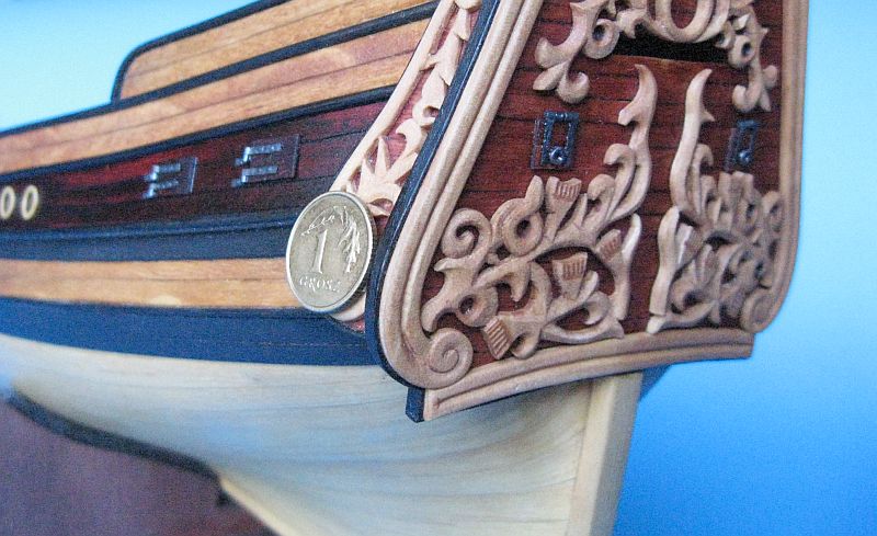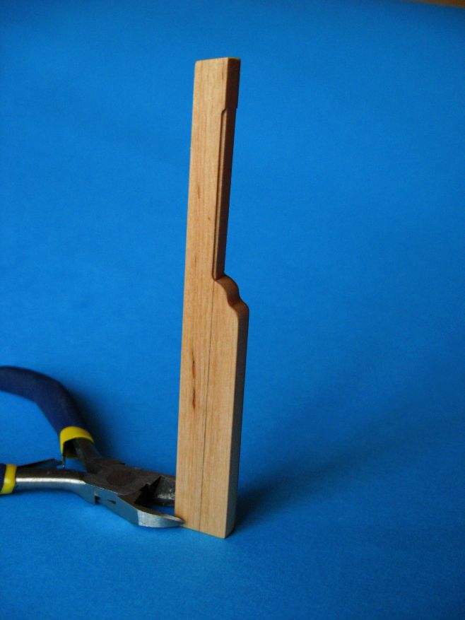 Technika wykonania - konsekwentnie fornirowo-kartonowo-listewkowa. Od strony kadłuba płetwa jest fazowana. Nad wgłębieniami jeszcze pomyślę po przymiarkach zawiasów. Zawiasy będą na długich sztabach, a rumpel będzie mieć przekrój kwadratowy "u podstawy" i prostokątny na końcu. Rozważam malowanie górnej części steru na kolor tła pawęży, ale to jeszcze nic pewnego.