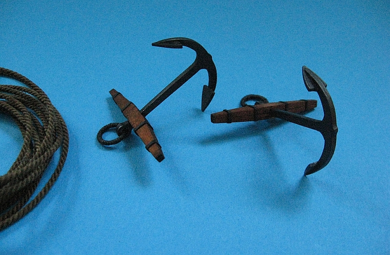 Kotwice są pomalowane emalią Humbrol nr 85, po której wyschnięciu spróbuję wykonać "metalizowanie" ołówkiem B6 i dorobię poprzeczki i bojki.