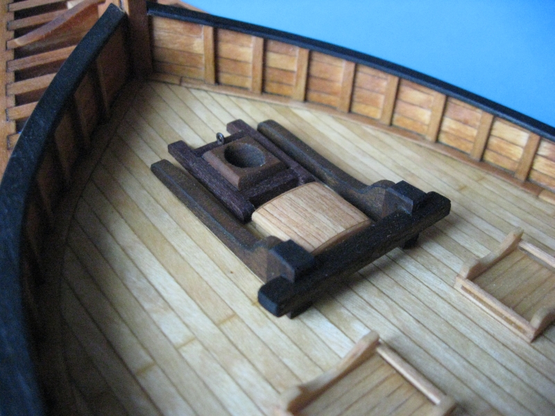 Tymczasem wykonałem kołkownicę na dziobie (to ten drewniany placek klejony z trzech warstw forniru: olcha-mahoń-olcha, jeszcze bez otworów na kołki) i przymierzyłem wykonane dotychczas drobiazgi