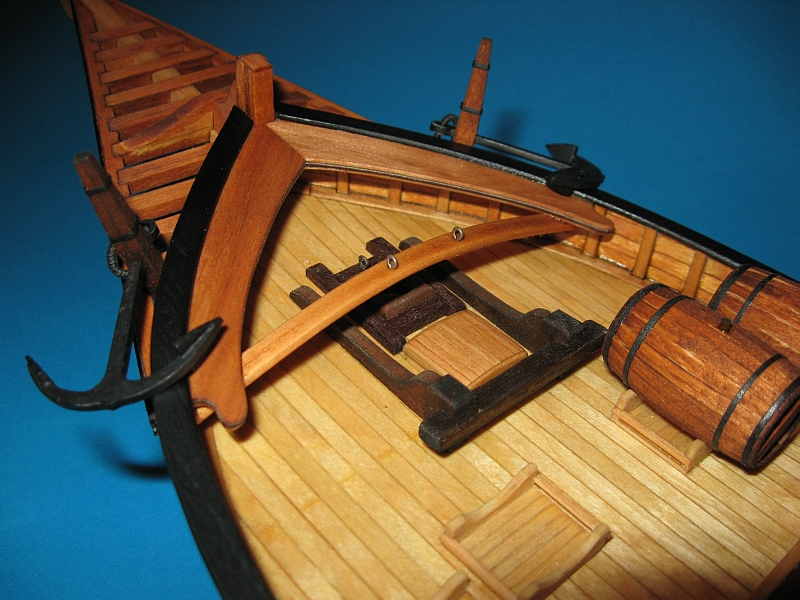 Poprzeczki wykonałem z listeweczek sapeli barwionych kombinacją bejc rustykalnych (ciemny orzech + cedr), złączonych ze sobą kartonowymi "płaskownikami". Wszystkim elementom "metalowym nadałem metaliczny połysk za pomocą wcieranego palcem ołówka B6, który uprzednio roztarłem na kawałku kartonu. Owijka ucha, to kordonek z Ariadny (30 tex x 6), barwiony na czarno. Kotwice zawisną w przyszłości na widocznej po lewej linie, którą skręcił dla mnie Mati (w końcu mam okazję podziękować Ci na forum, więc serdecznie dziękuję za pomoc Mati). Pozostało dorobienie bojek, ale zdecydowałem, że wykonam je nieco później.