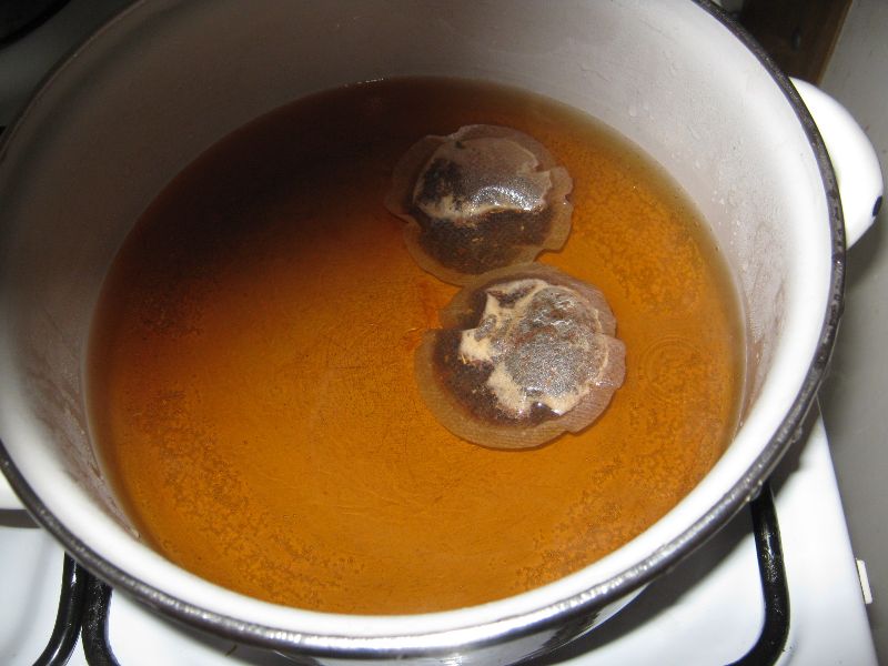 Szmatki wrzucałem pojedynczo, najlepiej jak najbardziej na płasko aby nie było zagięć. Do mieszania użyłem drewnianej ważechy (tak to jest po śląsku a jak po polsku to nie wiem :D ). Przy mieszaniu i przekładaniu w garnku szmatki trzeba uważać aby nie "zadrzeć" o dno lub bok garnka bo można żagiel pobrudzić ciemniejszym, herbacianym osadem - mi się tak zdarzyło ale miałem jeszcze zapasowy kawałek batystu.
