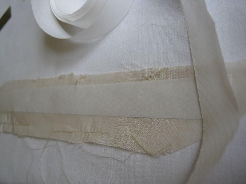 Do przyklejania naddatków na drugą stronę żagla, refbant i lików użyłem takiej taśmy krawieckiej do podklejania mankietów (nie wiem jak to się nazywa, dostałem od mamy). Taśma ta posiada klej, który topi się pod wpływem ciepła, jest prawie niewidoczny, dlatego specjalnie do zdjęcia przechyliłem pod światło ten żagielek aby było widać klej.