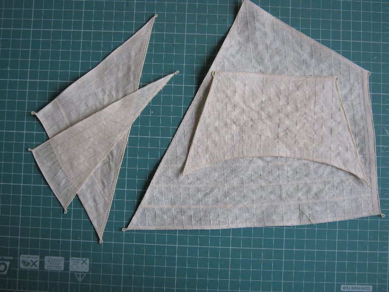 Batyst podzieliłem na mniejsze "szmatki" zależne od kształtów żagli z dosyć wielkim naddatkiem (bałem się, że przy wrzuceniu do wywaru z herbaty całego batystu niepociętego, ten się pobarwi niejednolicie, wolałem nie ryzykować więc lepsze były mniejsze kawałki aby mieściły się w garnku bez większego zaginania). Przed tym wszystkim wyciąłem jeszcze kilka mniejszych "szmatek", które posłużyły mi dalej jako próbki.