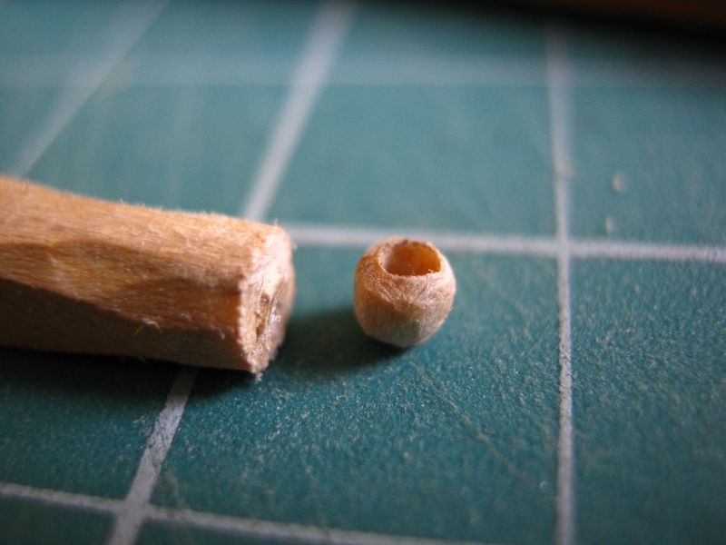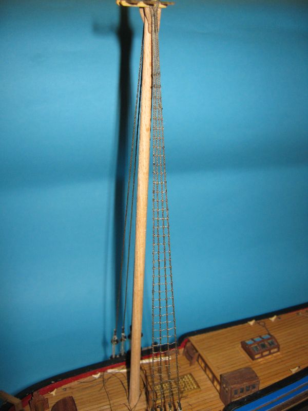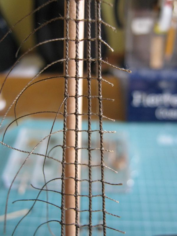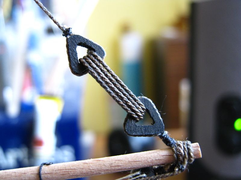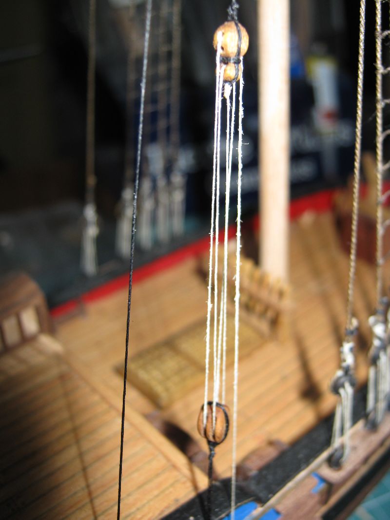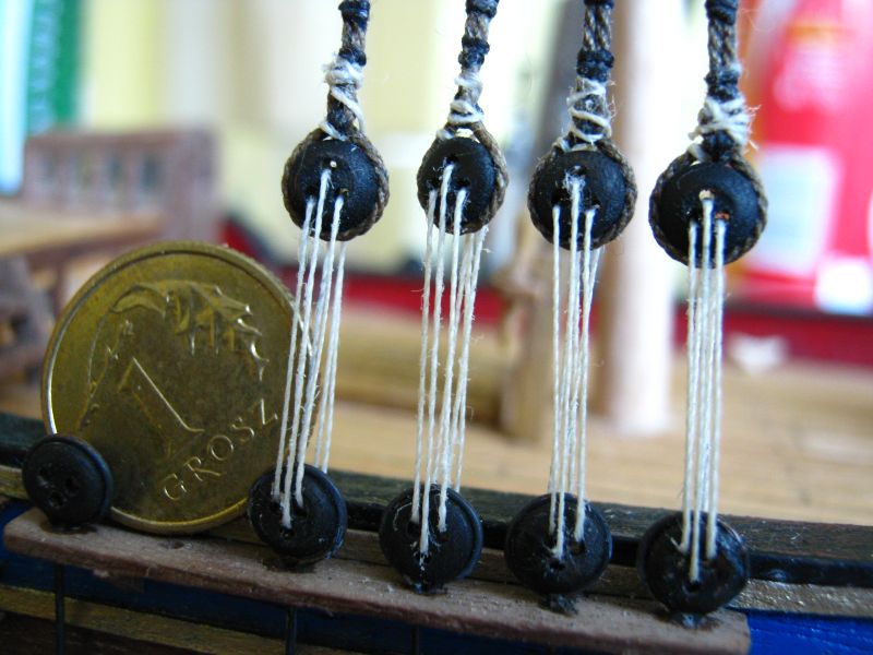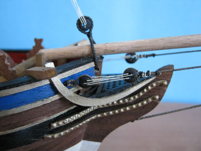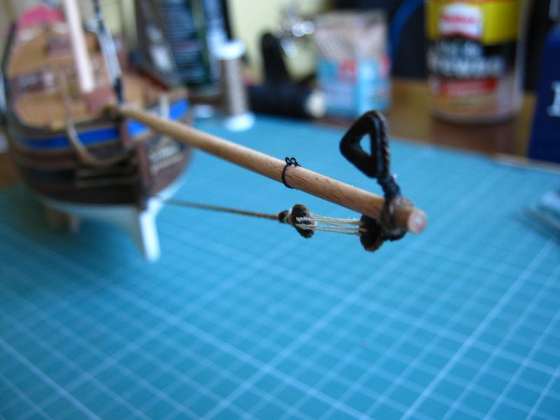 Zamontowałem parę sznurków, wkleiłem bukszpryt, poplątałem jakieś jufersy i bloczki, zrobiłem gałkę turecką.
