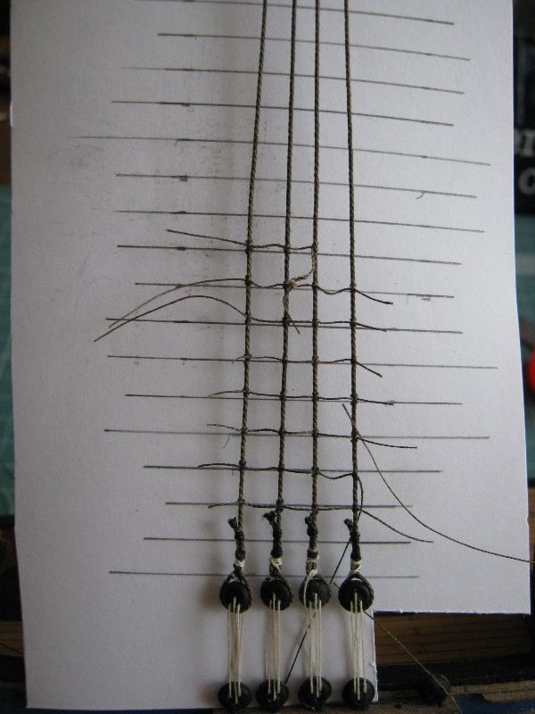 Porozwiązywałem te wszystkie wyblinki, które zrobiłem i już dzisiaj zmontowałem taki "przyrząd", który zmniejszył ruchy want na boki na samych talrepach(?). No i udało się to wszystko jakoś powiązać. Nie wiem czy nitka na wyblinki nie jest czasami za gruba i same węzełki zbyt toporne, oceńcie to. Tak już to zostanie.