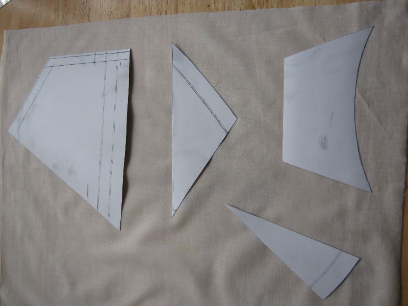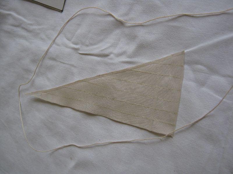Na wykrochmalonych szmatkach odrysowałem z brystolowych szablonów żagle i później bryty z wycinanki (batyst jest cieniutki i prześwitujący). Zwrócić należy także uwagę na to aby splot materiału szedł po długości żagla a nie krzywo na skos. Na zdjęciu jest akurat cała szmatka, nie pocięta na mniejsze kawałki (to zdjęcia z robienia tych pierwszych żagli). Właśnie tam też zrobiłem błąd bo najpierw odrysowałem żagle, później barwiłem i przy prasowaniu okazało się że większość z nich się "odkształciła" (batyst jest cieniutki i elastyczny)