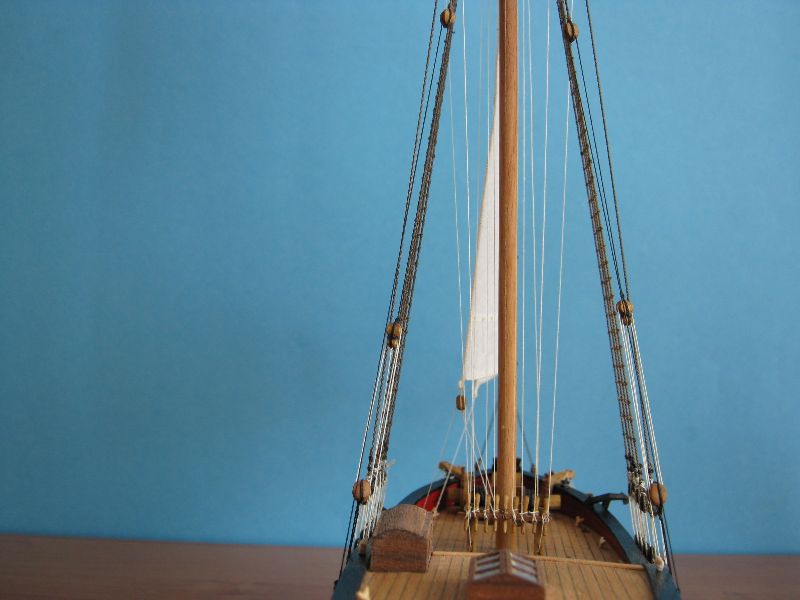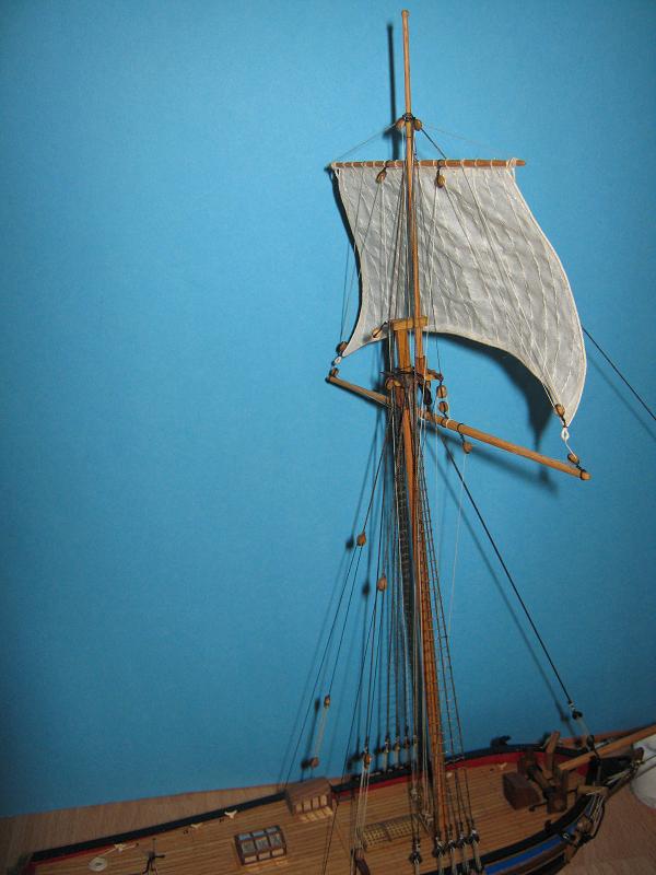 Osobiście żagielki mi się podobają. Pierwotnie liklina i liki miały być obszywane nitką ale po konsultacjach z bardziej doświadczonymi modelarzami doszliśmy do wniosku, że skala jest za mała. Reflinki na jednym na razie żagielku są doklejane na Patexxie (węzełek moczony w kleju i przyklejany), jakoś nie szło mi wiązanie węzełków z dwóch stron.