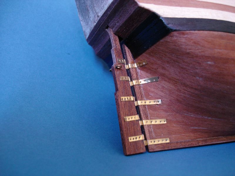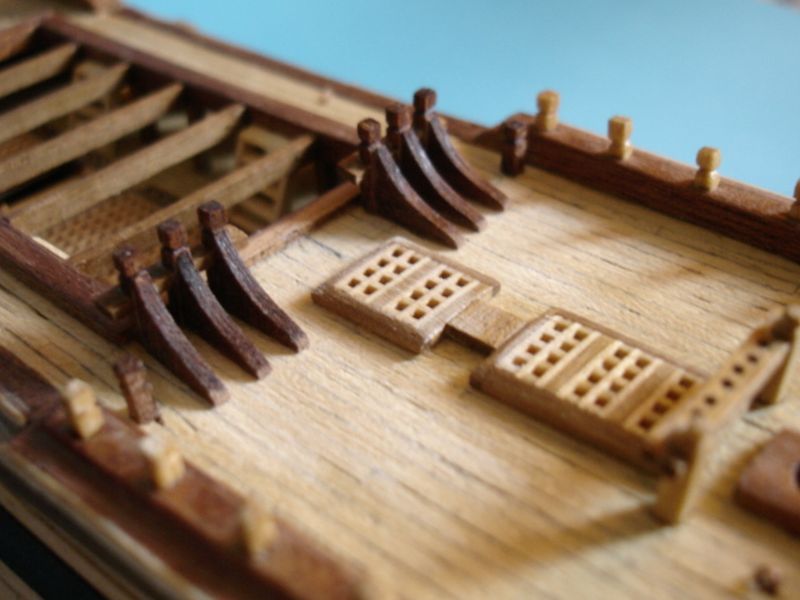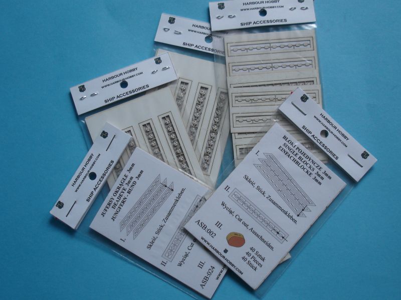 właśnie otrzymałem przesyłkę z bloczkami i jufersami z GPM MODEL i mini gwoździki z RB MODEL. Chciałem zabrać się za dalsze prace przy ławach tarlepowych i jufersach, ale postanowiłem przed tym zmienić okucia steru i stewy. Chcę tu zastosować mini gwoździki imitujące nity. Dotychczas są to otwory nakłute ostrym szpikulcem. Myślę, że jest ich za dużo.