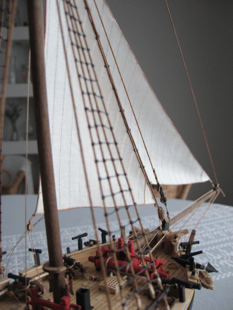 Ale jedna rzecz mi się tutaj nie podoba, bloczki są jakieś takie kanciate i psuja ogólny widok. Jak dla mnie bloczki są za kwadratowe i przy tej skali bardzo to widać. Są na rynku przecież bloczki znacznie lepszej jakości a ten modelik stanowczo zasługuje na wykończenie ekstra. Tym bardziej Adamie że takielunek robisz przyzwoicie. Nie jest to wielki model i nie ma wielu masztów i rei wiec ilość bloczków nie jest wielka a wiec koszty zakupu lepszych bloczków nie będą wysokie ale za to model naprawdę zyska na wyglądzie. Zrobisz jak zechcesz ale sadzę że koledzy "Trociniarze" się ze mną zgodzą.