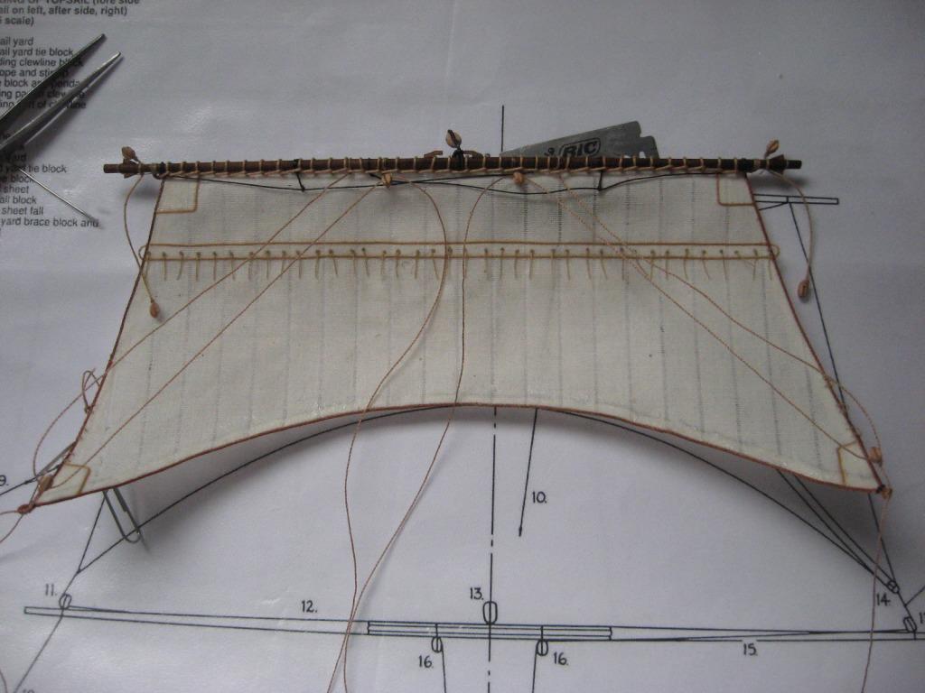 Zamocowałem bom i pracuje nad ostatnim żaglem mainsail - grot (gaflowy).