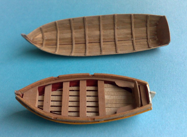 Szalupy robione są na kopytkach. Wręgi wycięte z tektury 1 mm pomiędzy wręgi balsa , a wszystko oklejone taśmą. Ta pomalowana robiona jest z deseczek balsowych , ta surowa z fornirowych (ale i tak będę malował). Z planów jakie dostałem od Oksala na Endeavour`rze były 4 szalupy natomiast Shipyard przewidział 3 i co wybrać?