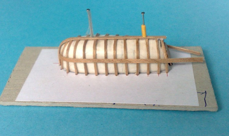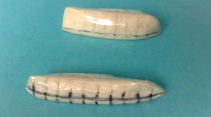 Technika ogólnie znana, ale dla przypomnienia, ewentualnie dla tych co zobaczą to po raz pierwszy. Wręgi wyrysowane na podstawie planów, naklejone na tekturę 1 mm i wycięte . Wypełnienie między wręgami - modelina, następnie przeszlifowane i oklejone taśmą samoprzylepną. Tak powstałe kopytko przymocowałem do tekturki, powierciłem otwory na przyszłe wręgi, następnie przymocowałem stewę i paski forniru imitujące wręgi. Całość okleiłem paskami forniry ( Longbota -od góry na dół, Yawl - od dołu do góry - deski wychodzą " na zakładkę"