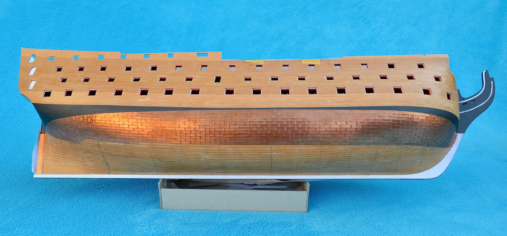 1) W marcu 1780 roku dno statku poniżej linii wodnej zostało osłonięte 3923 miedzianymi arkuszami, celem zapewnienia ochrony części dennej przed świdrakiem okrętowym. Płyty miały długość 4 stóp i szerokość 14 cali, co dla skali 1:96 daje płytkę o długości 12,7 mm i szerokości 3,7 mm. Moje płytki są ciut niewymiarowe, bo mają 13 mm długości i 4 mm szerokości – będę musiał z tym żyć.
