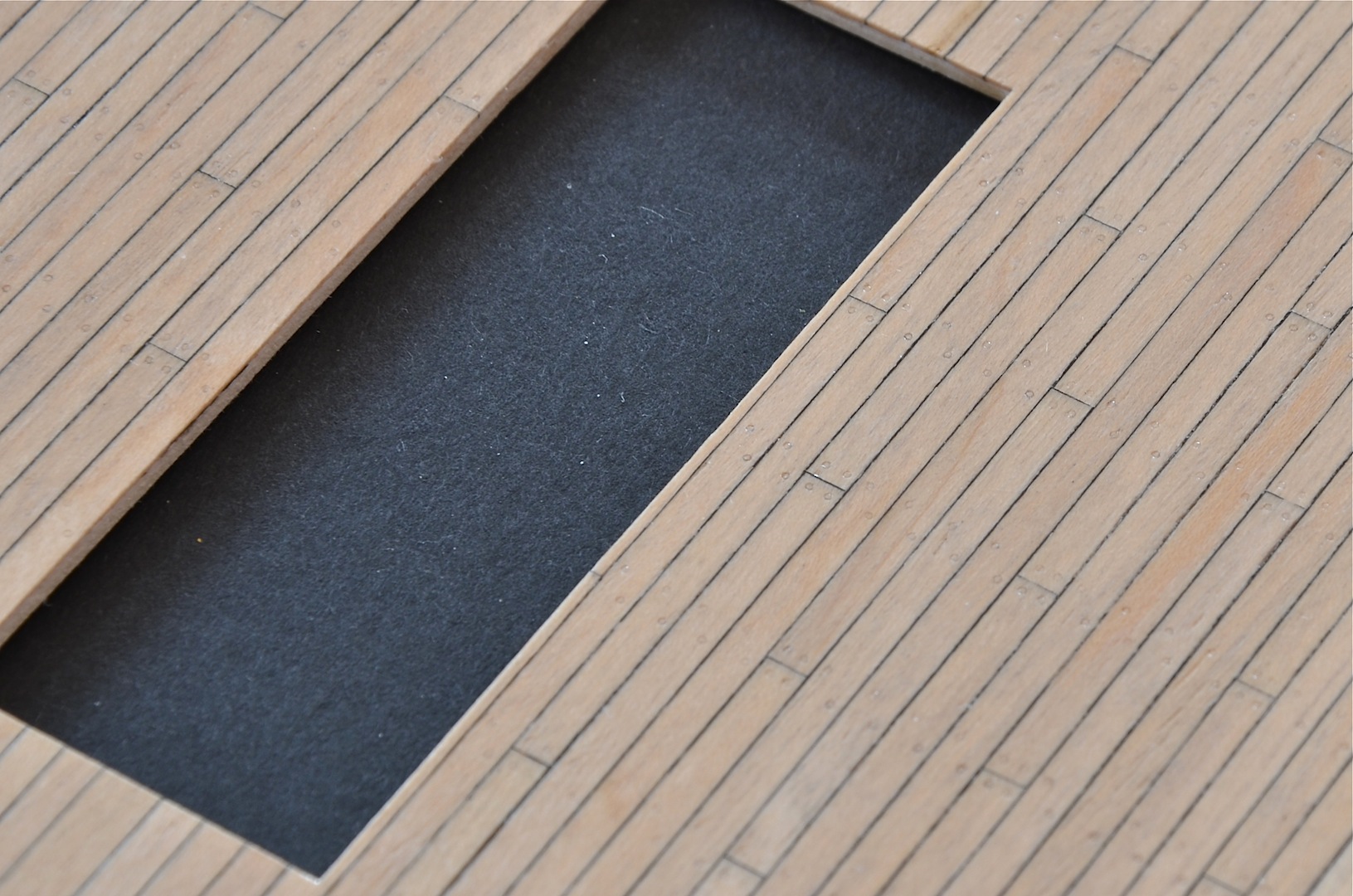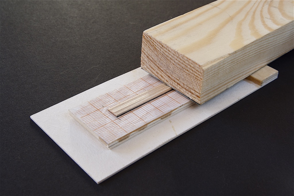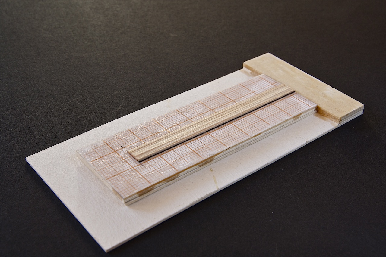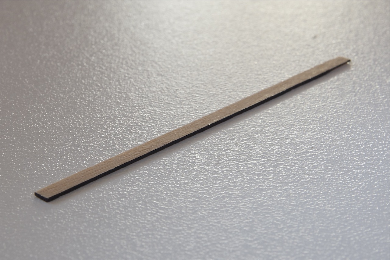 Przed wykonaniem ambrazur wstępnie przymocowałem pierwsze poszycie do kadłuba za pomocą taśmy malarskiej i zaznaczyłem na listewkach pozycję otworów. Następnie listewki rozcinałem na odcinki odpowiedniej długości tak, aby mieściły się pomiędzy wręgami.