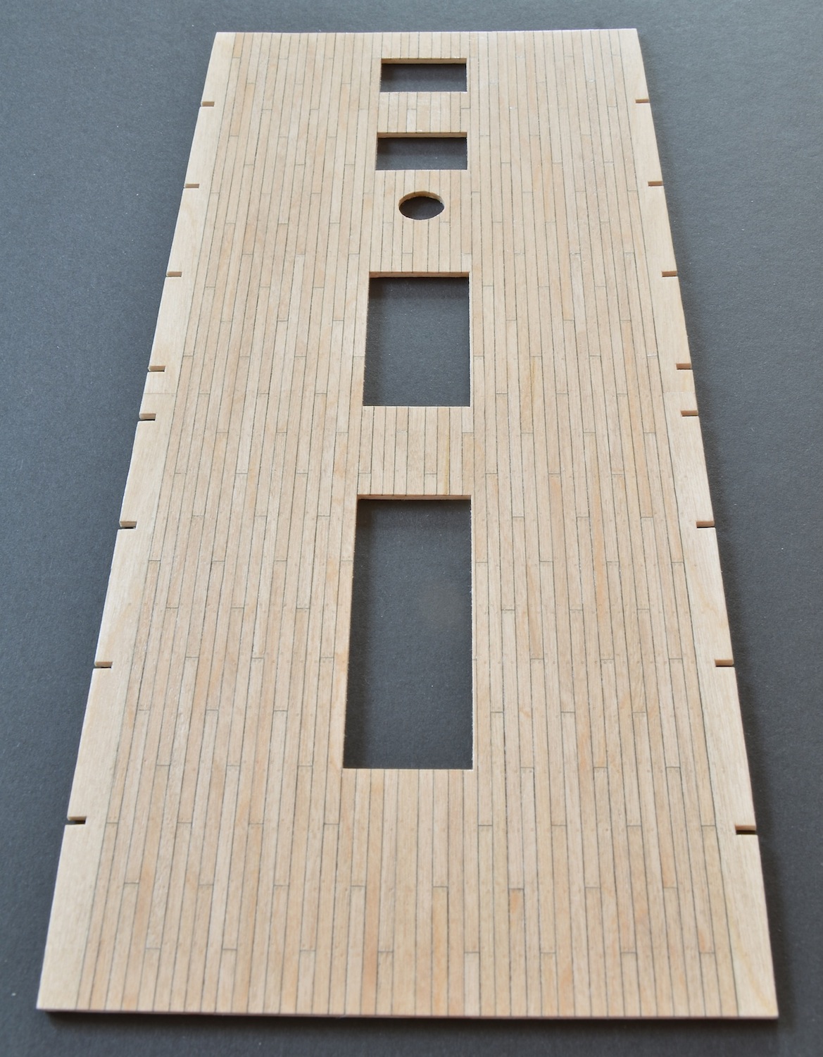 W trakcie wstępnego mocowania poszycia uwidocznił się drobny błąd w projekcie. W centralnym miejscu jednej z ambrazur jest widoczna wręga, którą trzeba będzie wyciąć. Ten błąd zauważyłem również w relacji Doris, więc nie jest to tylko moje niedopatrzenie