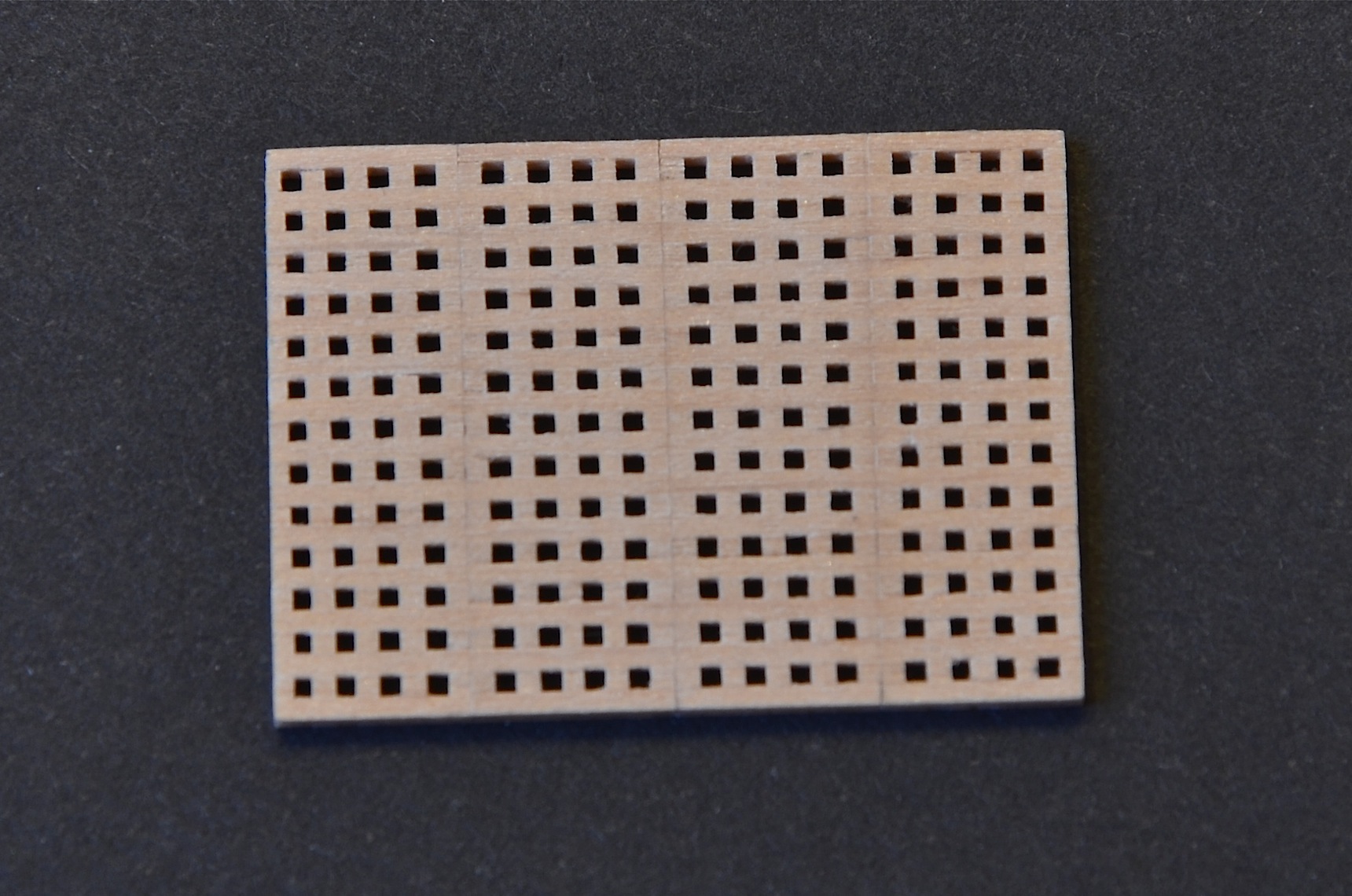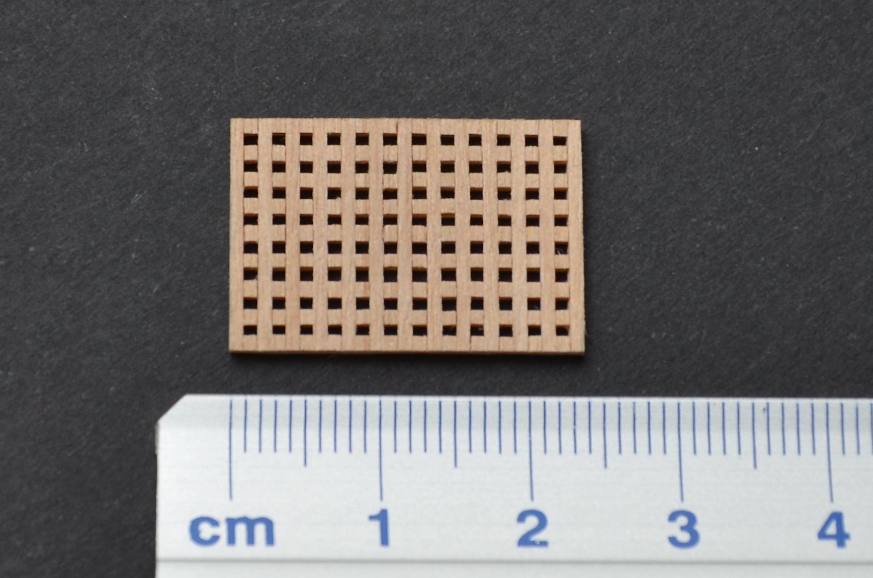 Po kilku nieudanych próbach zrobiłem swój pierwszy greting, wg metody opisanej tutaj http://www.koga.net.pl/forum/viewtopic.php?f=10&t=45378. Początkowo próbowałem wykonywać go z forniru brzozowego. Sklejałem ze sobą dwie warstwy forniru tak, aby uzyskać arkusz o grubości 1 mm. Tak gruby fornir brzozowy trudno było jednak ciąć żyletką - cięcie było albo krzywe, albo odłupywały się ząbki. Efekt widać na pierwszy zdjęciu. Ostatecznie greting wykonałem z forniru olchowego, który jest miękki i łatwiej poddaje się cięciu. Nie jest idealnie, ale efekt chyba o niebo lepszy od pierwotnych dokonań. Wielkość oczek ok. 0,8 mm. Greting nie jest jeszcze wyszlifowany i polakierowany.