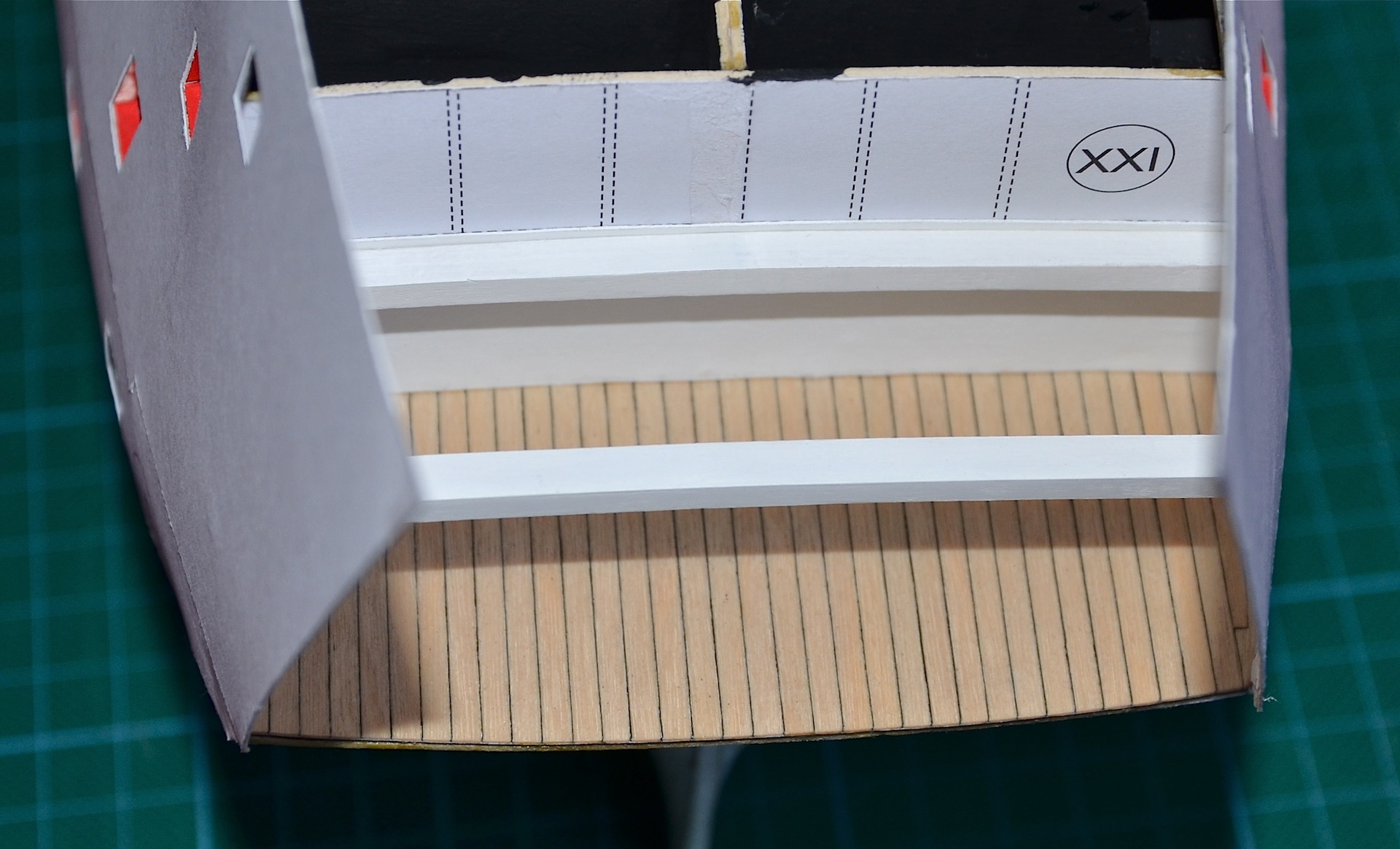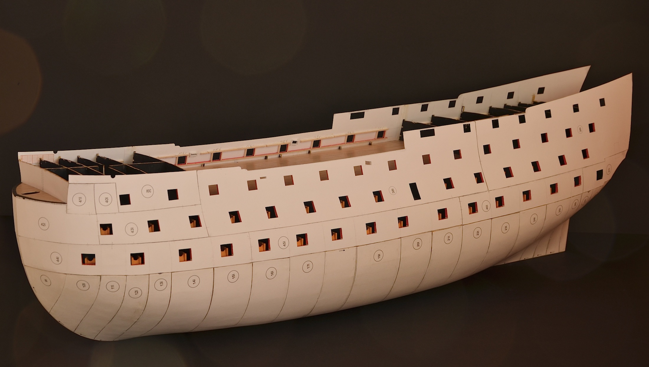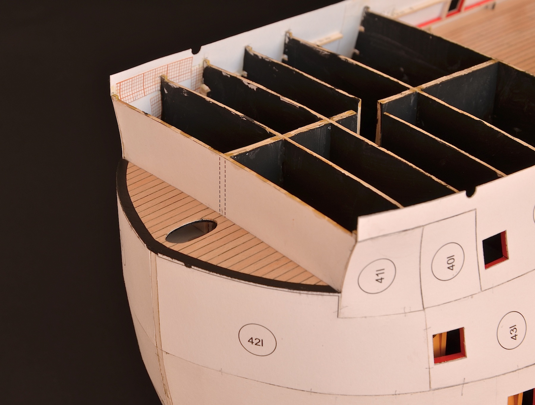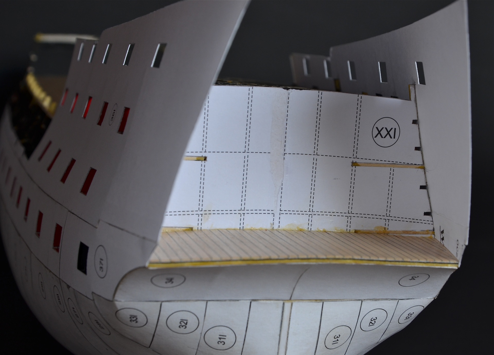 Wprawdzie powoli, ale zawsze do przodu. Częściowo ułożyłem pierwsze poszycie powyżej linii wodnej. Postanowiłem też wykonać pomieszczenia załogi, widoczne przez okna galerii rufowej. W oryginalnej wycinance przewidziana jest tylko kajuta kapitana; ja zamierzam wykonać dodatkowo kajutę admirała oraz oficerów niższej rangi tzw. wardroom. W tym celu usunąłem (czyt. wyrąbałem :D ) część szkieletu przewidzianego w rufowej części okrętu.