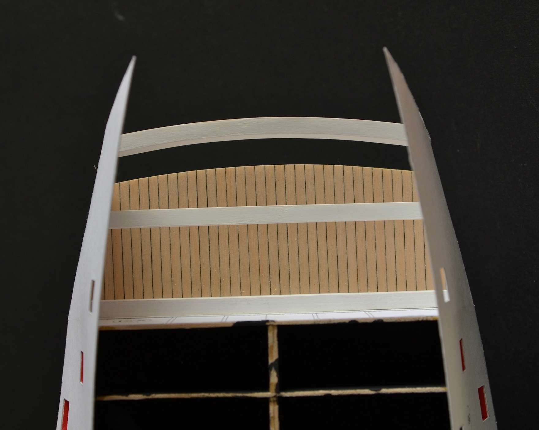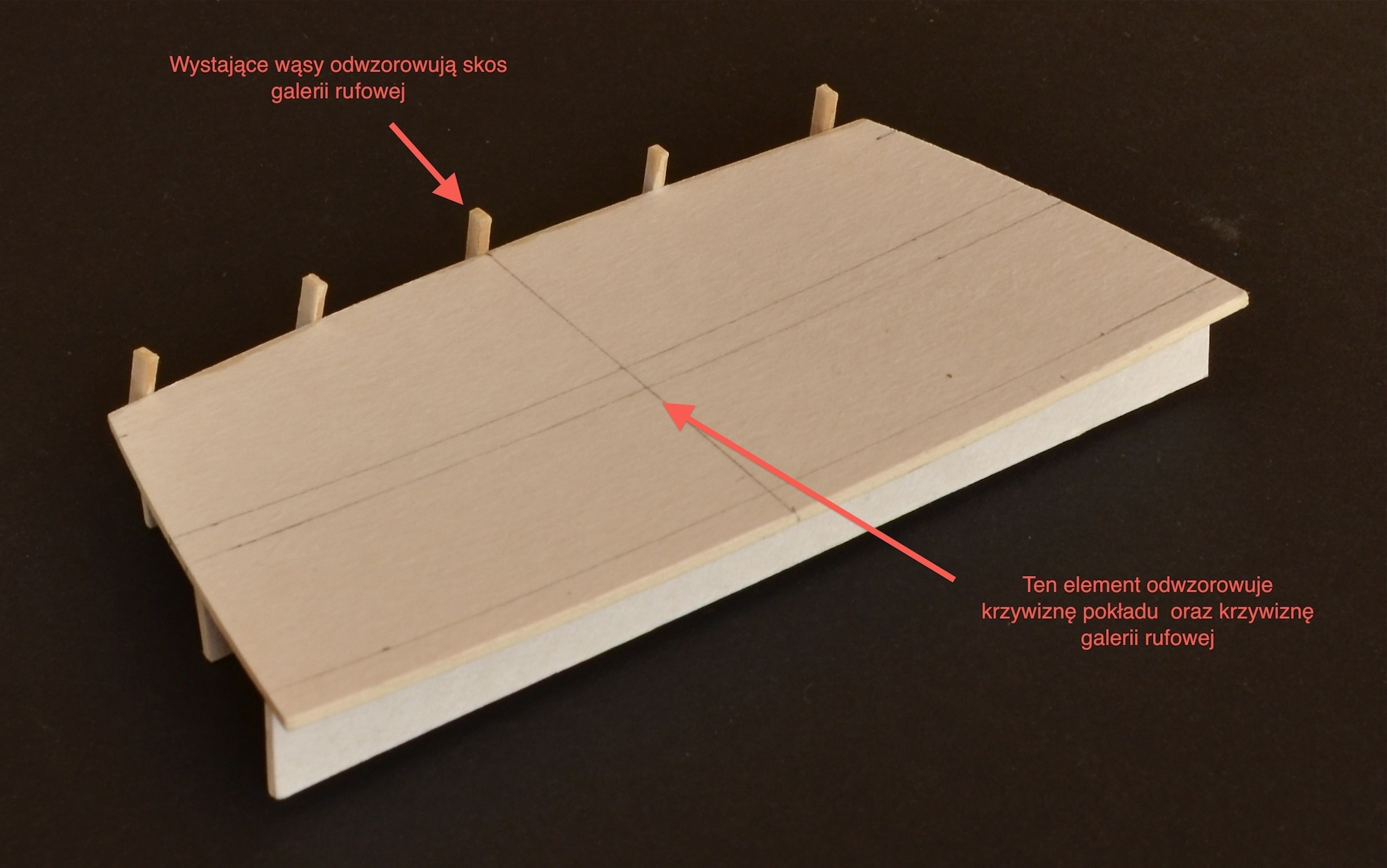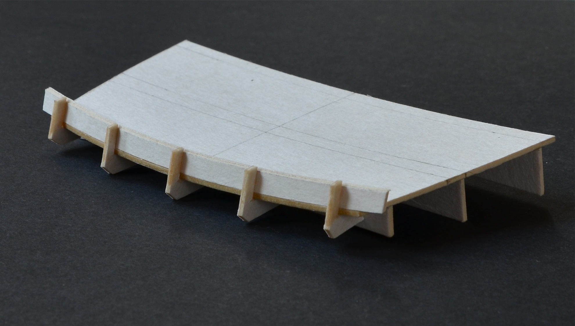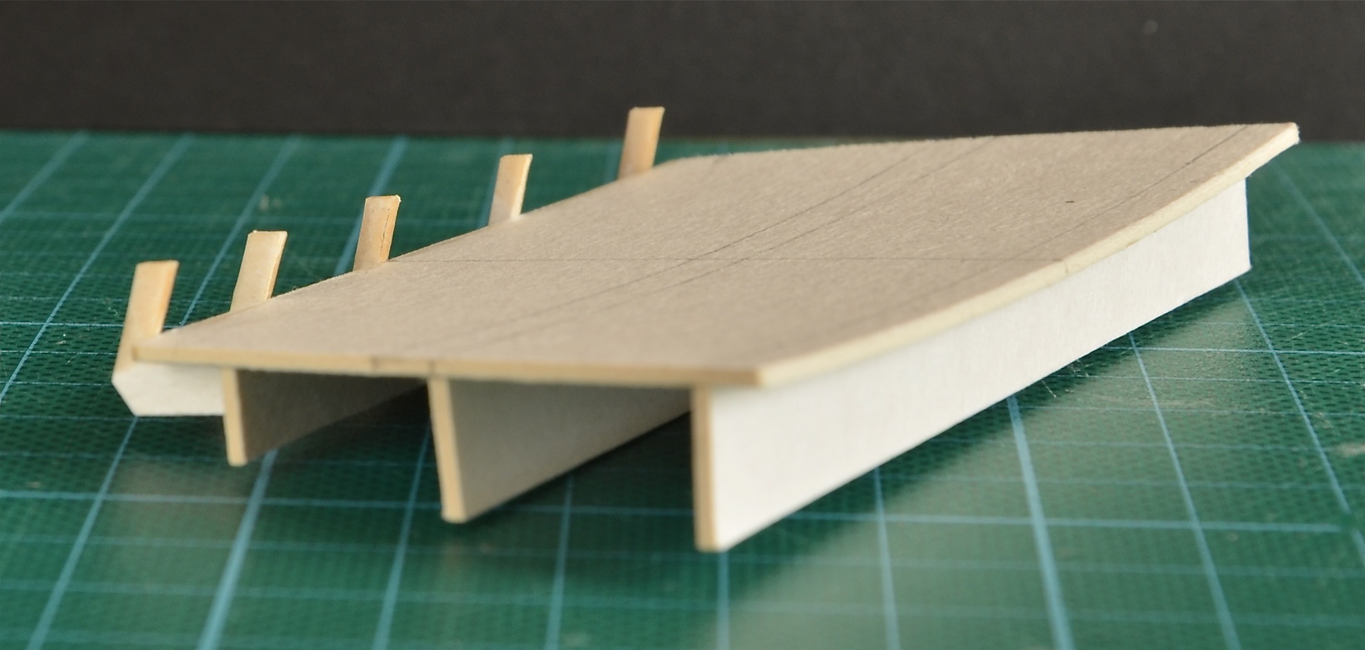 Powstały dwa pierwsze pokładniki; trzeci najbardziej skrajny z uwagi na skomplikowany kształt jest w trakcie budowy. Pierwsza jego wersja trafiła do kosza. Pokładniki sklejone są z czterech warstw tektury o gr 1 mm, zalanej CA i oszlifowanej do pożądanego kształtu.