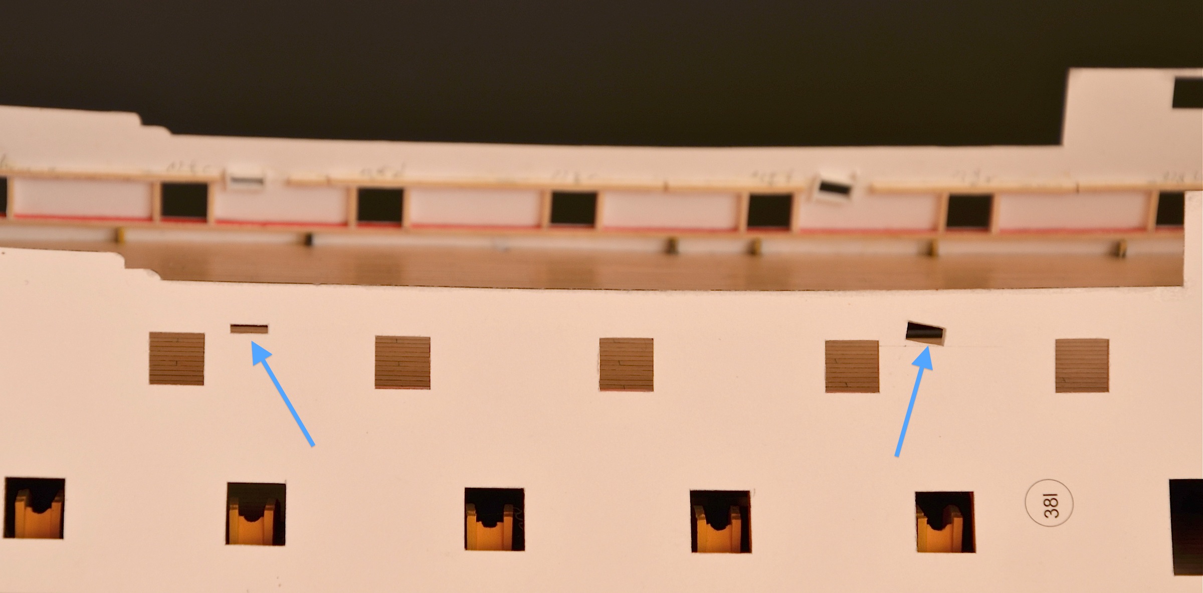W burtach górnego pokładu działowego wykonałem dodatkowo dwa otwory na szybry, przez które będą przechodzić szoty foka i grota. Te otwory nie były przewidziane w oryginalnej wycinance.