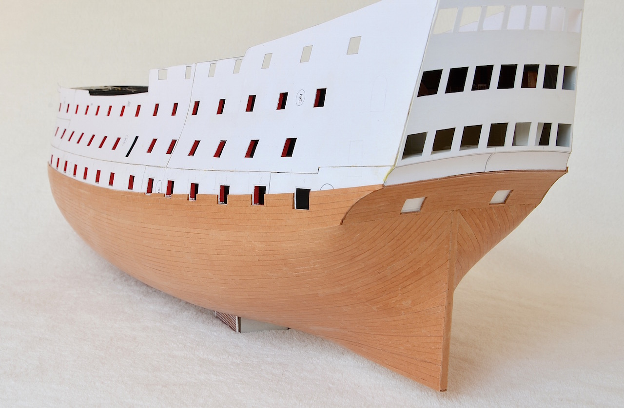 Następnie postępowałem tak jak poprzednio to opisywałem przy układaniu poszycia części dennej tj. wykonany szablon przykleiłem do preszpanu, wyciąłem kształt oklejki wyrysowanej na kalce technicznej, następnie po wewnętrznej stronie oklejki wyznaczyłem przebieg planek i po tej stronie rozcinałem oklejkę na poszczególne, wąskie planki. Później tylko mozolne pasowanie do kadłuba i przycinanie pasków odpowiednio do ułożenia ambrazur.