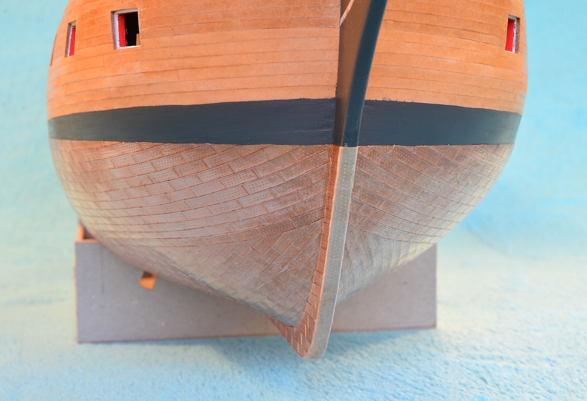 Dociekliwi znawcy tematu mogą zauważyć, że kształt planek ułożonych przeze mnie na głównym pasie jest nieco odmienny niż na innych modelach. W wielu modelach zarówno na głównym pasie wzmocnień tzw. main wale, jak i na środkowym pasie wzmocnień, planki układane są tak jak na drugim z rysunków. Różne źródła podają na temat układu tych planek odmienne informacje. Ja wykonałem je według opisu z książki Longridge'a. Co ciekawe, na obecnym okręcie w ogóle nie zauważycie planek ułożonych w tzw. anchor stock.