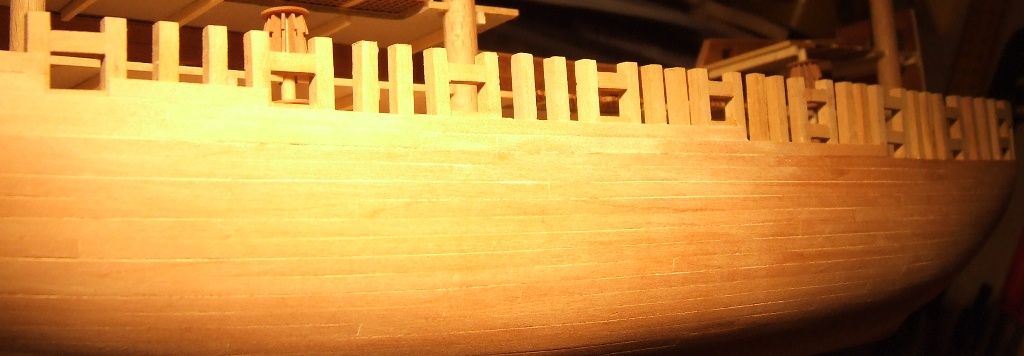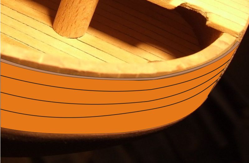 Dziób będzie pokryty plankami z obu stron do wysokości "prawie" końcówek wręg dziobowych.