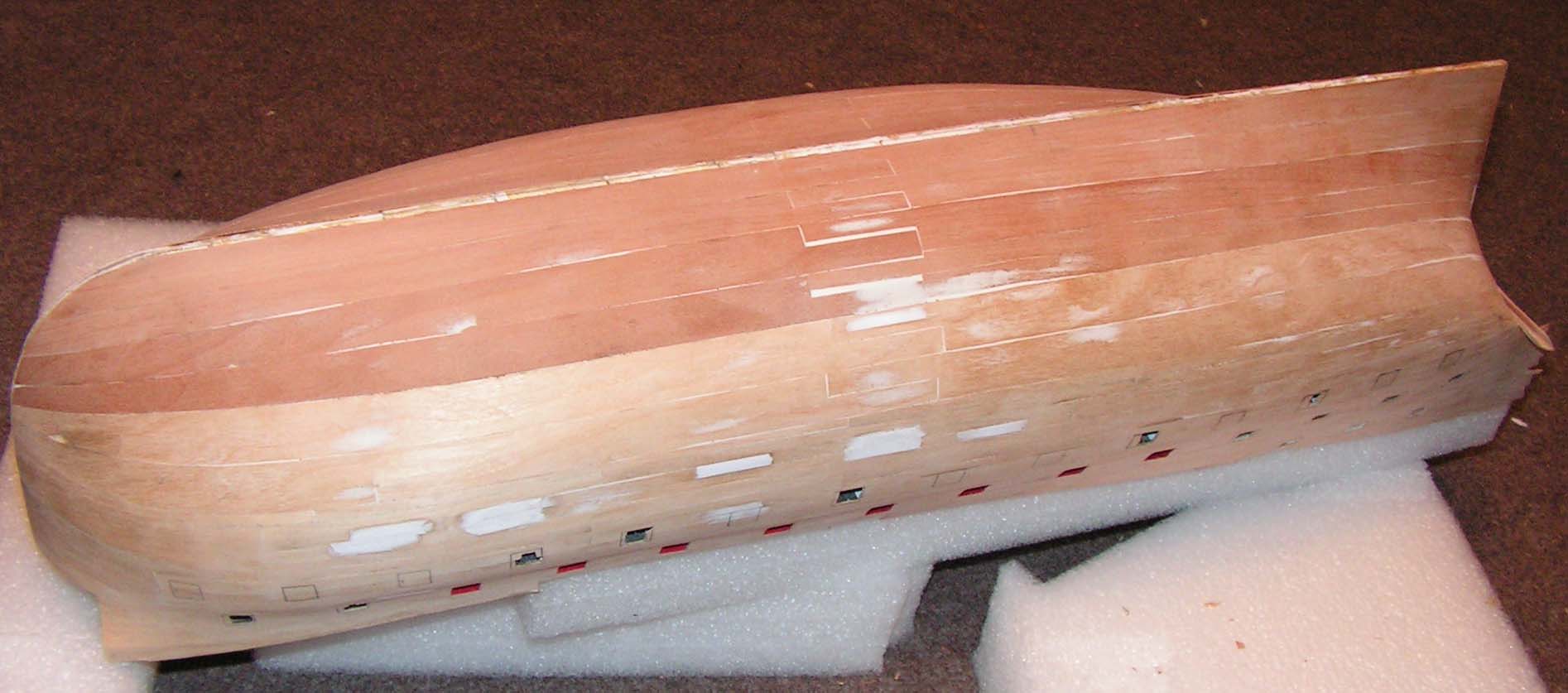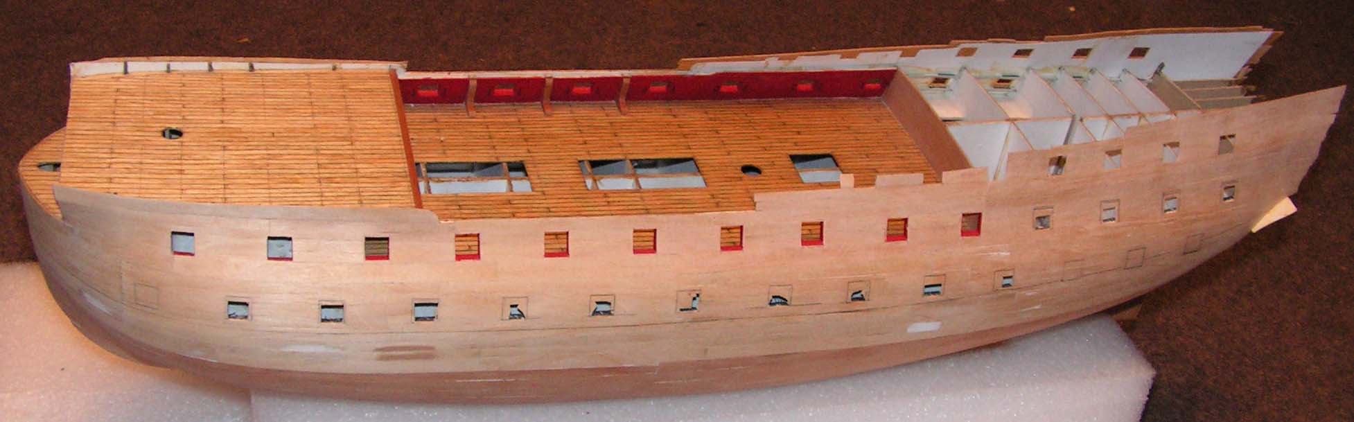 Mało czasu na modelarstwo, ale prace powoli idą naprzód. Dodatkowym problemem jest skąpy opis budowy w wycinance i brak planów. Posiłkuję się internetem, ale i tak pewne prace trzeba robić intuicyjnie. Udało mi się zrobić wszystkie gretingi, artylerię środkowego pokładu, okleić kadłub pierwszą warstwą poszycia i kil. Najbardziej jestem zadowolony z przełamania problemu rzeźb zdobiących burty, kasztel rufowy i dziobowy.