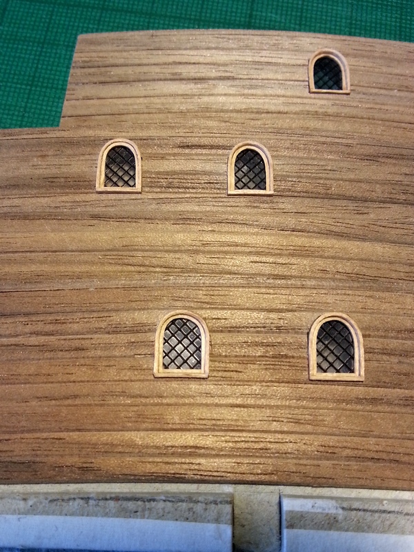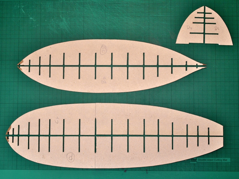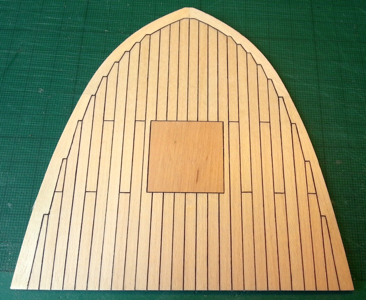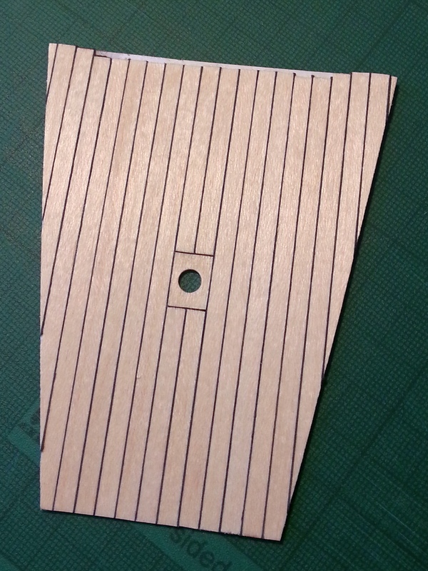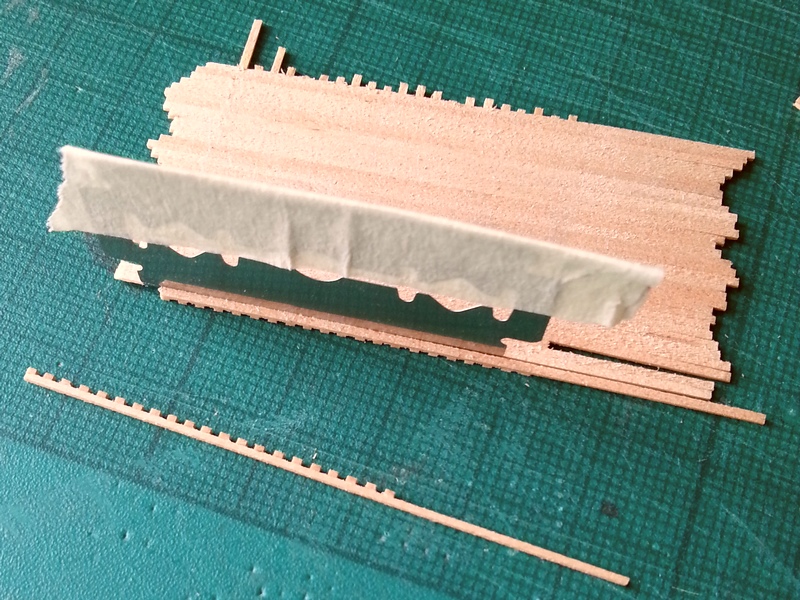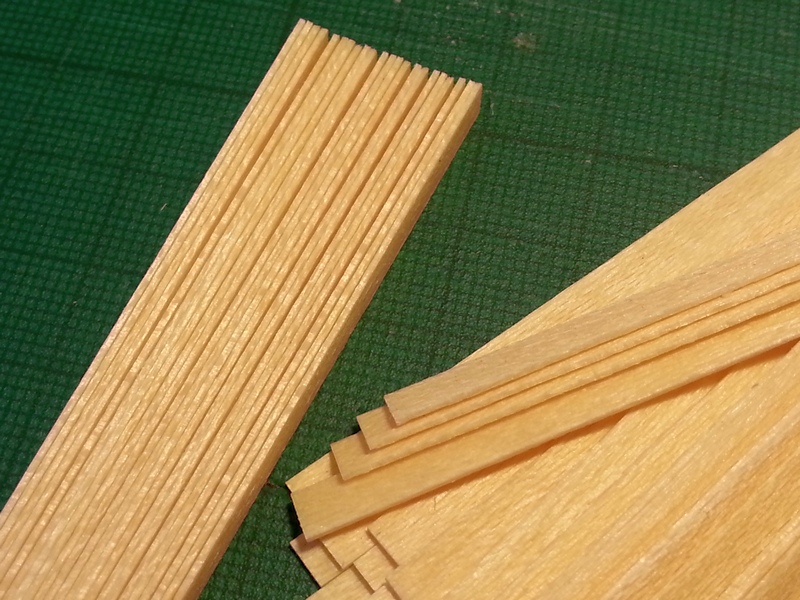 Pociąłem też trochę planek 4mm na pokłady. Fornir ciąłem na mokro i ciąłem go żyletką. Krawędź cięcia jest o wiele lepsza niż spod skalpela i tnie się szybciej (wystarczy tylko jedno przeciągnięcie żyletki). Inna sprawa że trzeba ciąć ostrożniej bo żyletka się gnie. Wyszło mi tak: