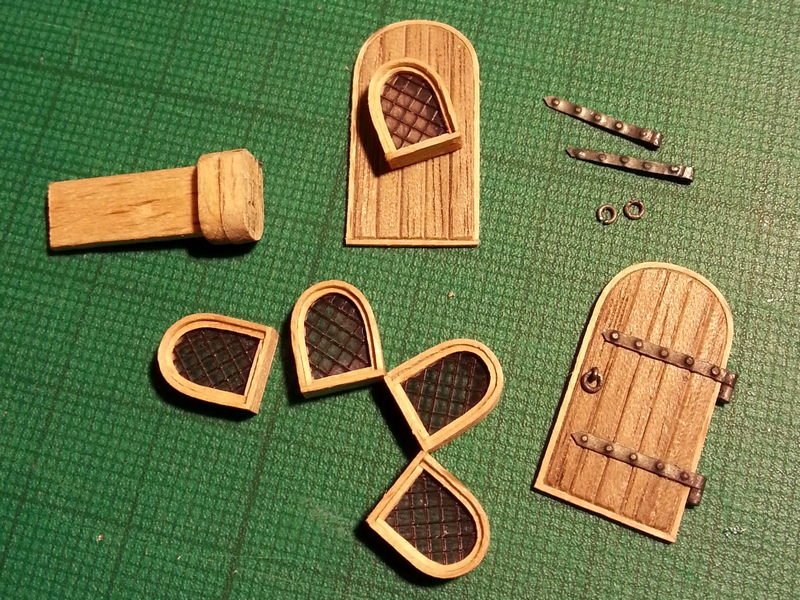 Zawiasy drzwi to blaszka po konserwie turystycznej grubości 0,2mm i pocięta w paseczki o szerokości około 1,2mm. Następnie powyciskałem nity za pomocą stępionego lekko gwoździka i małego młotka. Trzeba lać lekko żeby się nie przebić. Po kilku próbach wiedziałem już jakiej siły użyć aby każdy następny nit wyszedł w miarę podobnie. Tak potraktowane zawiasy lekko naprostowałem szczypkami przyklepując nieco nity. "Klamki" to drucik stalowy 0,5mm z torebki po chlebie, nawinięty na wiertło 1mm i następnie pocięty w pojedyńcze pierścienie. Wszystko opalone nad zapalniczką w celu poczernienia.
