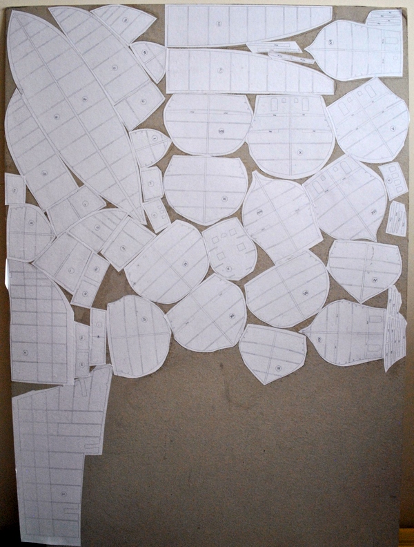 Model będę budował metodą kartonowo fornirową czerpiąc z wiedzy zawartej na forum i posiłkując sie "encyklopedią" Wolframa Zu Mondfelda, którą udało mi się ostatnio zakupić (szczerze polecam). Wycinankę zeskanowałem i wydrukowałem w formacie A3. Po minucie z linijką obliczyłem, że uzyskana skala to około 1:69. Wręgi podkleiłem tekturą 3mm. Szkielet zamierzam wypełnić pianką a jako główny materiał na poszycie wybrałem fornir orzech amerykański grubości 1mm. To nie grusza, ale innego tej grubości nie mam. Pozatym podoba mi się kolor i to, że fornir ten pocięty w listewki dobrze poddaje się gięciu poprzecznemu. Na pokłady fornir brzozowy 0,6mm a wszelkie malowidła na burtach mam w planach wykonać metodą intarsji stosując mahoń sapele, brzozę, buk i może coś jeszcze. A teraz to, co do tej pory udało mi się wykonać: