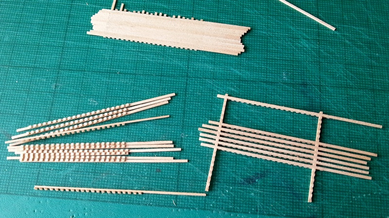 Listwy biegnące w osi okrętu to zwykłe listewki. Do montażu użyłem też grzebyków co jakiś czas, by zachować równy odstęp między listwami, ale pod koniec je też zamieniłem na zwykłe listewki. Ostatecznie grzebyki biegną tylko w poprzek gretingu i po obwodzie.