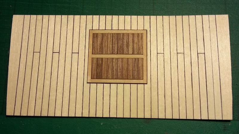 Pociąłem też trochę planek 4mm na pokłady. Fornir ciąłem na mokro i ciąłem go żyletką. Krawędź cięcia jest o wiele lepsza niż spod skalpela i tnie się szybciej (wystarczy tylko jedno przeciągnięcie żyletki). Inna sprawa że trzeba ciąć ostrożniej bo żyletka się gnie. Wyszło mi tak: