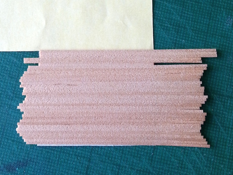 Pociąłem też trochę planek 4mm na pokłady. Fornir ciąłem na mokro i ciąłem go żyletką. Krawędź cięcia jest o wiele lepsza niż spod skalpela i tnie się szybciej (wystarczy tylko jedno przeciągnięcie żyletki). Inna sprawa że trzeba ciąć ostrożniej bo żyletka się gnie. Wyszło mi tak: