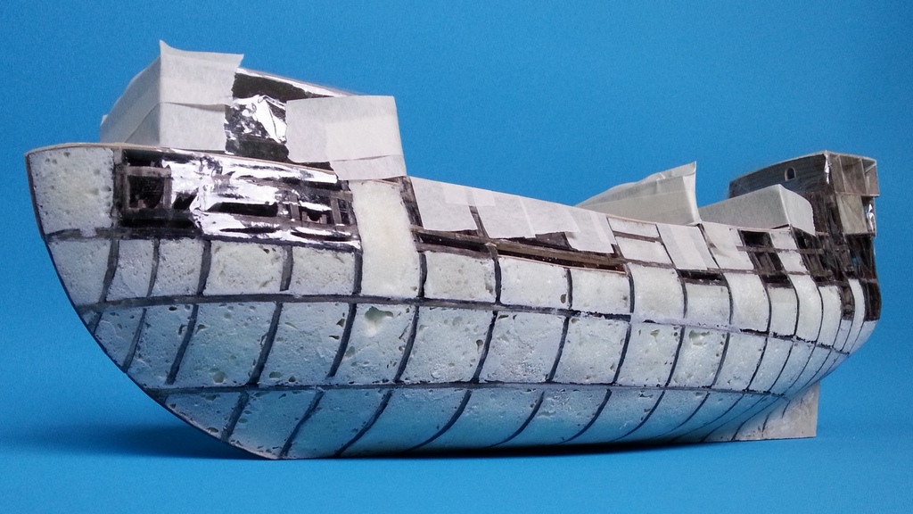 Szkielet z tektury 3mm plus dość gęsto rozmieszczone wręgi i pianka nie narobiła żadnych szkód, tzn. nie powykrzywiała szkieletu. Lekko wypaczyły się pokłady podklejone cienkim brystolem, ale za to mam nauczkę na przyszłość aby wklejać je później lub użyć szablonu zamiast nich.