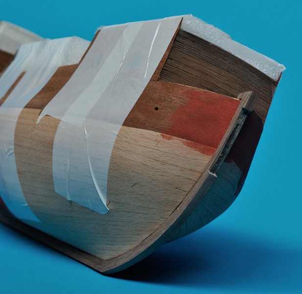 Mirku masz rację. Nie będę kombinował bo jeszcze przekombinuję i wyjdzie kasztan jakiś. Będę trzymał się Shipyarda. Naciąłem zatem kilka listewek 3,5mm i zabrałem się za oklejanie pawęży. Odbojnice to dwie listewki gr. 0,8mm i jedna 0,6 sklejone razem dla uzyskania odpowiedniej grubości i zabejcowane. To pierwszy kontakt z bejcą w moim życiu :) Wszystko kleiłem na „butapren” i miejscami CA. Listewki wyginałem poprzecznie w palcach chuchając na nie. Łuk był niewielki więc ta metoda się sprawdziła :) I tak to wyszło: