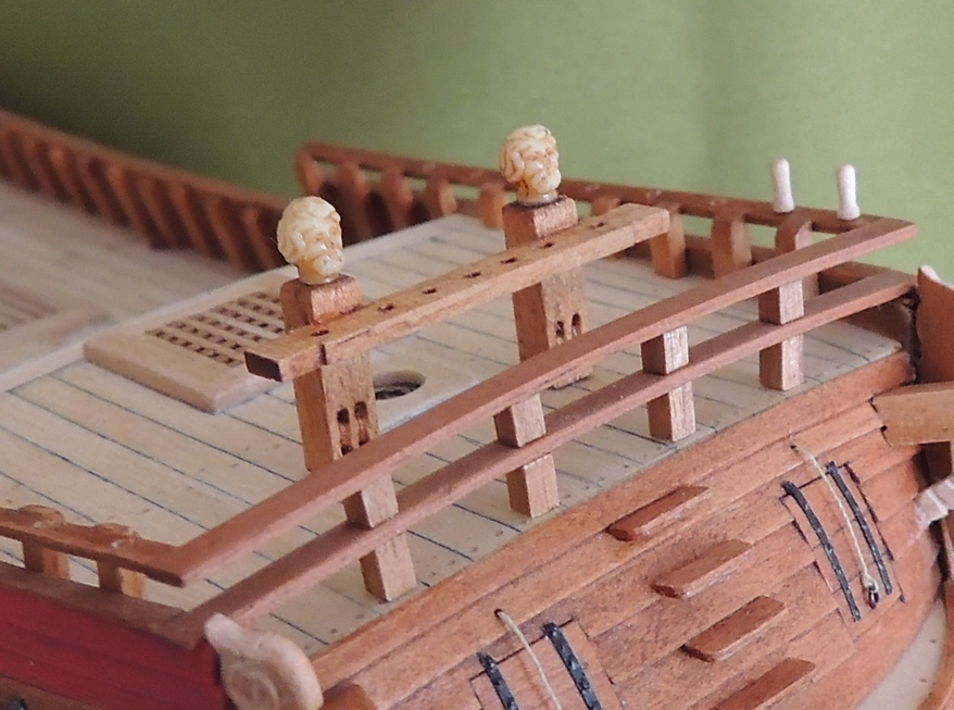 Zabieram się za pachoły i tu mam dylemat. Czy pozostawić to co proponuje Shipyard, czyli tradycyjne trapezowe zwieńczenia, czy wymienić na głowy tak jak to jest np. na Batavii.Problem w tym, że pachoły są różnej grubości, a głowy mam tylko w jednym rozmiarze. Na zdjęciach pokazałem o co mi chodzi.