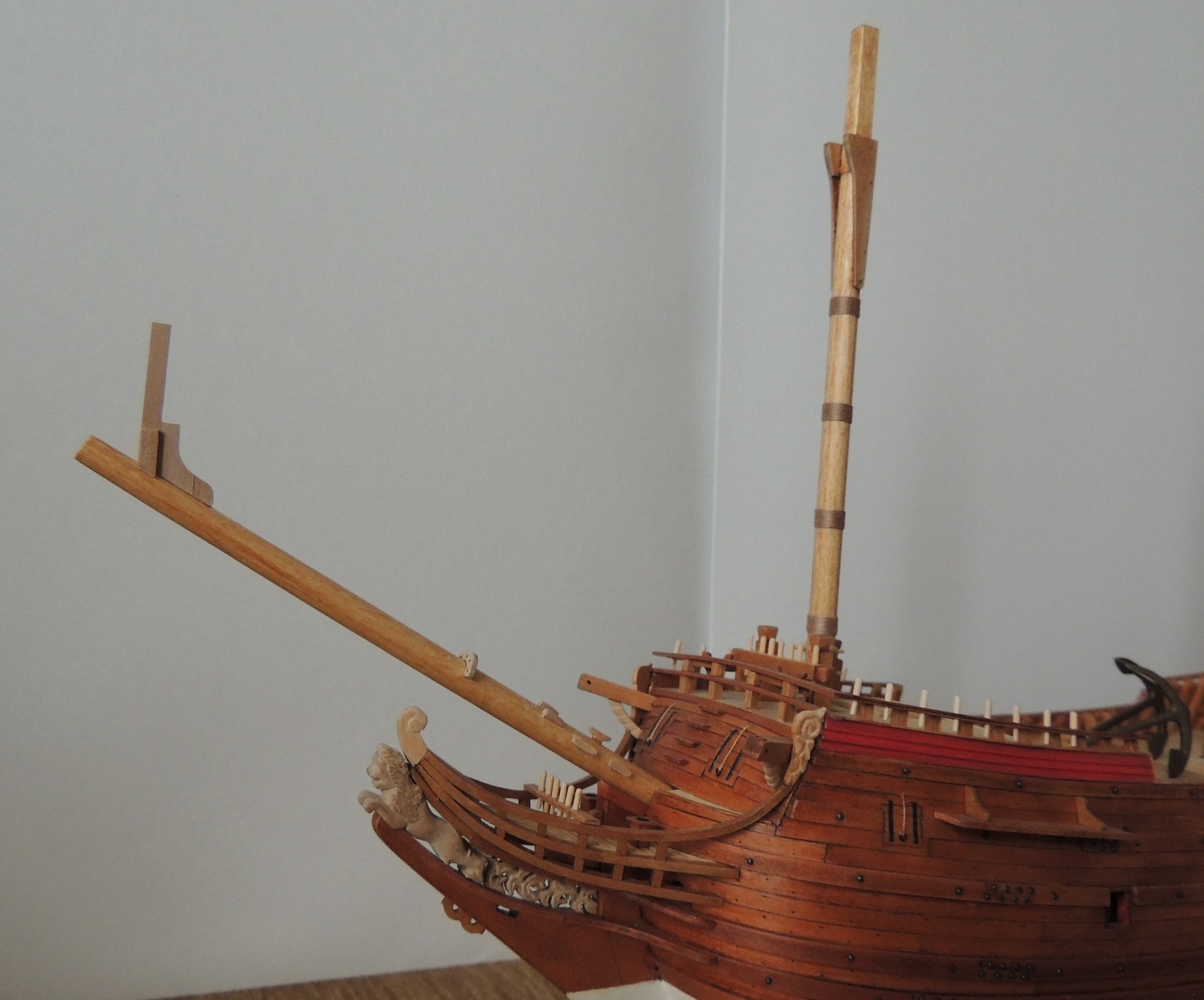 Już niewiele tych drobiazgów zostało mi do zrobienia. Przybyły schodki przy nadburciach, knagi nad ambrazurami, pałąk do poruszania sterem(nie mam pojęcia jak to się fachowo nazywa) i trochę okuć.