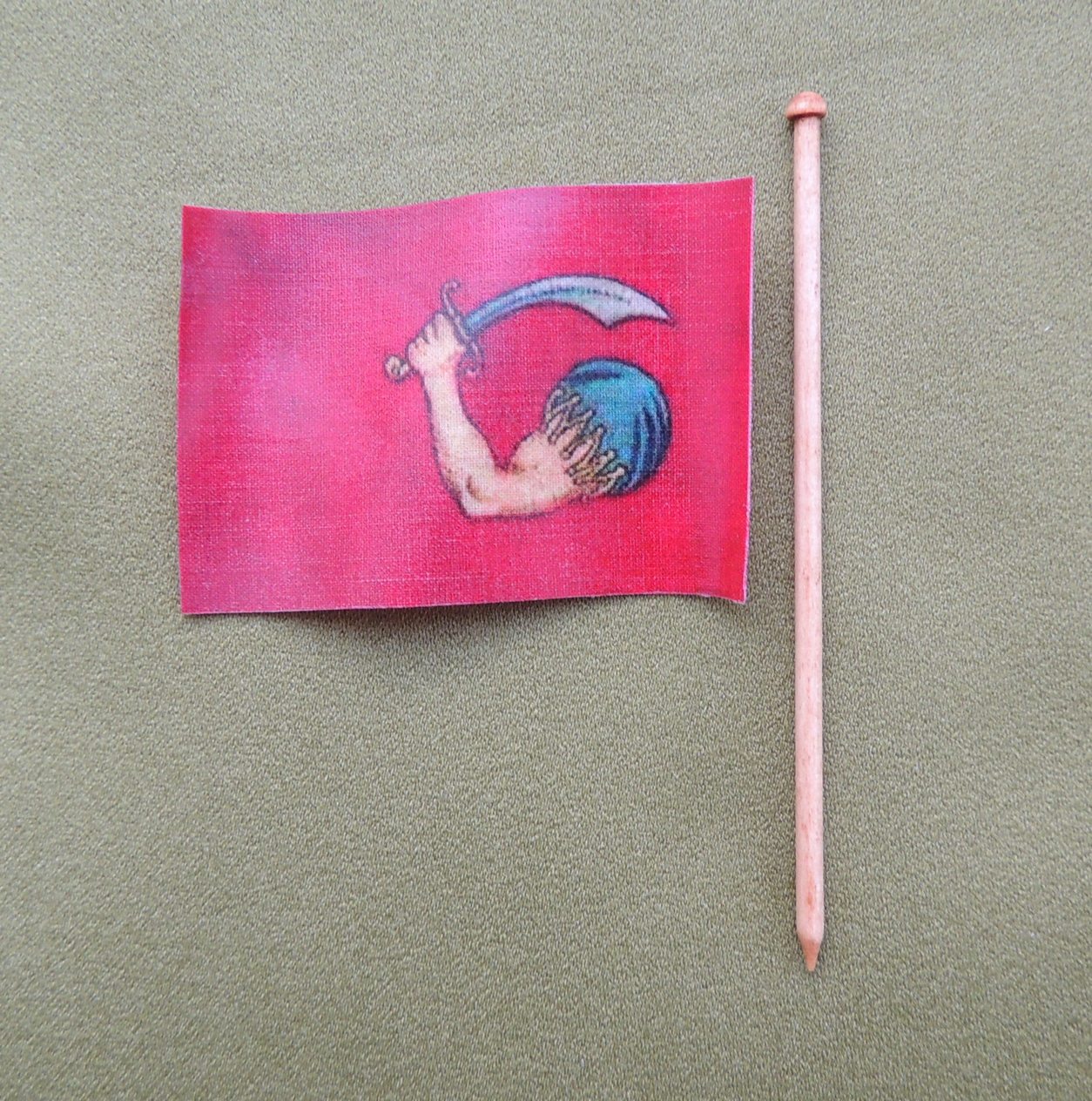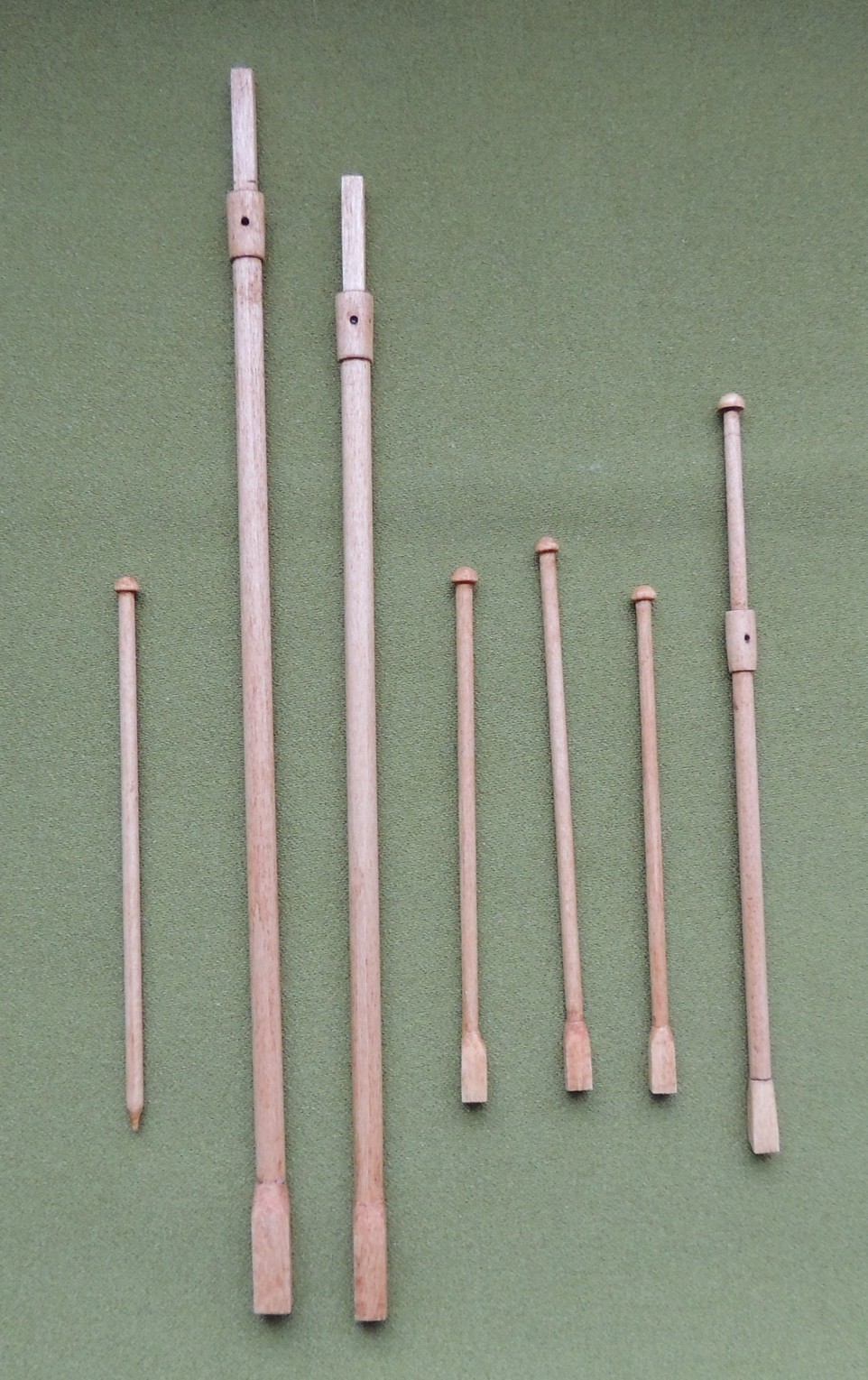Cześć.Wszystkie pionowe patyki gotowe. Do zrobienia zostały reje. Flagi zrobione metodą Kazka, czyli papier termotransferowy i cienkie płótno.Wymagają jeszcze podmalowania krawędzi.