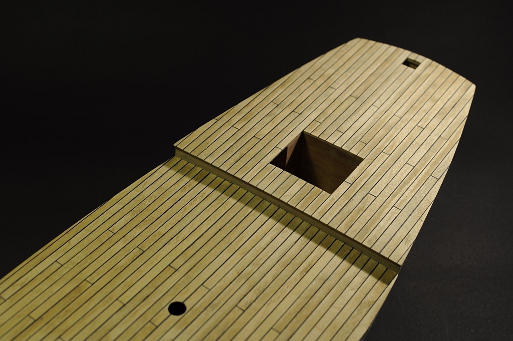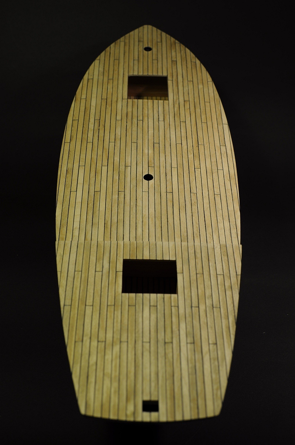 Rozpocząłem deskowanie pokładu fornirem (fornir brzozowy). Deseczki szer. 4 mm z wklejonym czarnym kartonem 0,2 mm. Układ deskowania zgodny z planami Shipyard.