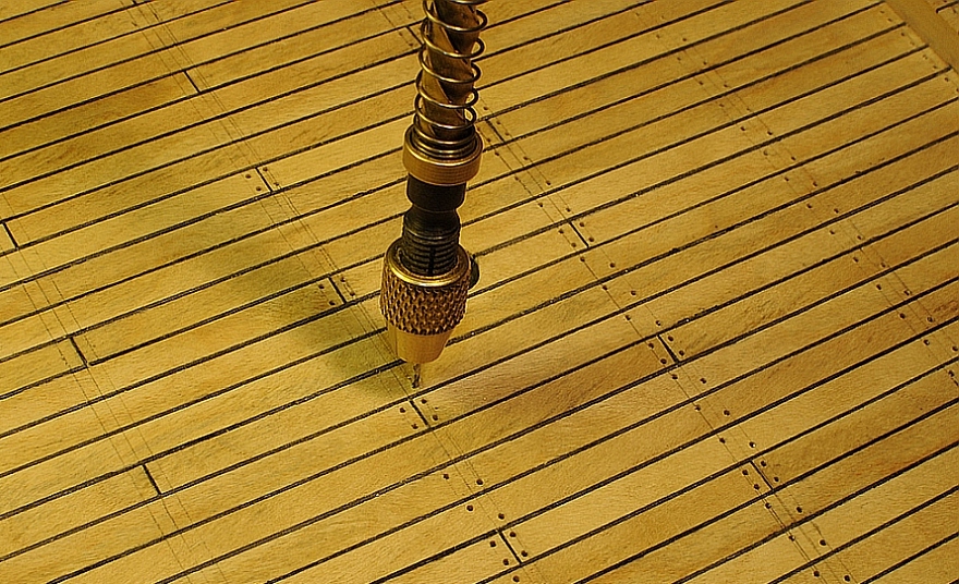 Wywierciłem otwory pod kołki w pokładzie. Otwory wykonałem furkadełkiem – wiertło Ø 0,7 mm. Aby ułatwić sobie pracę, linię wiercenia zaznaczyłem ołówkiem (później wytarte gumką). Celowo nie wykonałem otworów wzdłuż burt i włazów – zostaną wykonane po ich wklejeniu