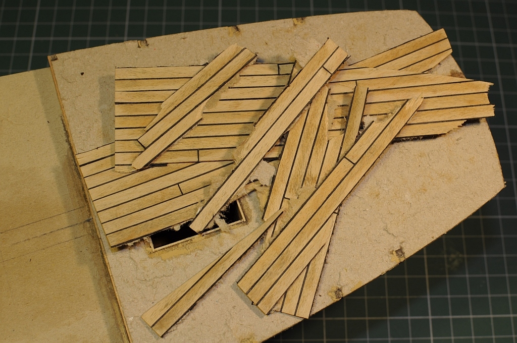 Rozpocząłem deskowanie pokładu fornirem (fornir brzozowy). Deseczki szer. 4 mm z wklejonym czarnym kartonem 0,2 mm. Układ deskowania zgodny z planami Shipyard.