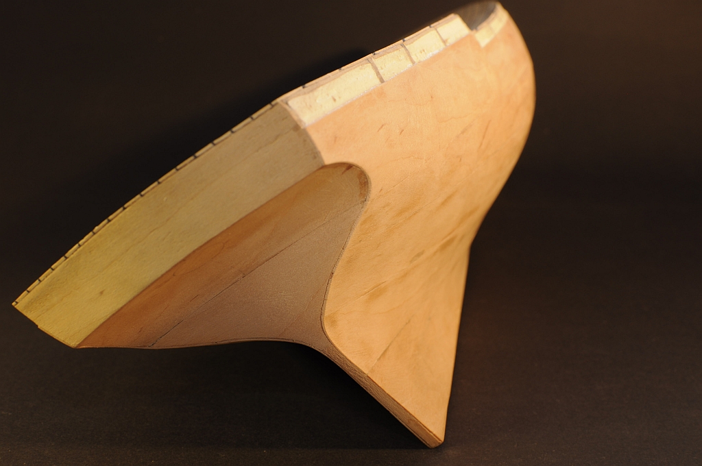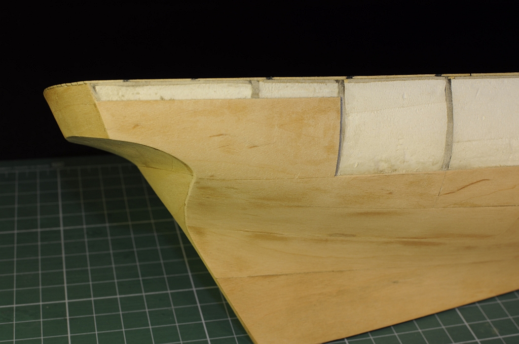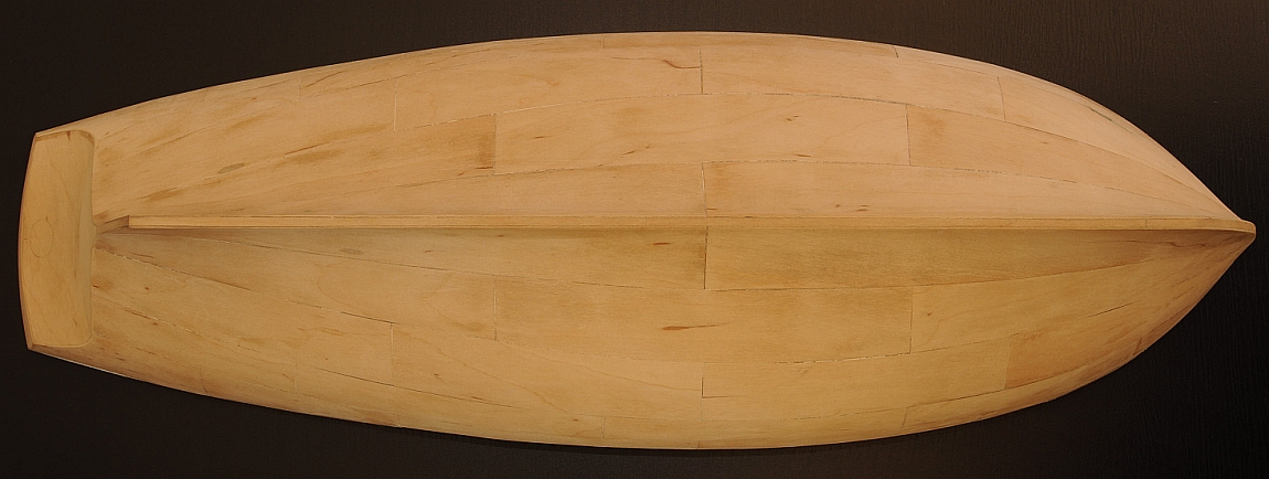 Pierwsze poszycie - fornir olcha 0,6 mm. Poszywanie wykonałem w odwrotnej kolejności niż w planach Shypyard. Oklejanie rozpocząłem od dna w kierunku pokładu. Elementy (są większe niż w planach) zostały przygotowane w następujący sposób: za pomocą taśmy malarskiej przenosiłem kształt na fornir a następnie wycinałem nożykiem, później dopasowałem papierem ściernym, fornir moczyłem wodą, wilgotny wklejałem na Pattex Expres, całość przeszlifowałem panierem ściernym naklejonym na 30 cm listewkę. Ponieważ jest to pierwsze poszycie za bardzo się nie przykładałem i pozostały niewielkie szczeliny. Pozostawiłem nieoklejony siedmiomilimetrowy pas od strony pokładu - ma to na celu „łatwiejsze manewrowanie” kadłubem podczas kolejnych prac tj.: wklejenie stępki i wykonanie zakładkowego poszycia.