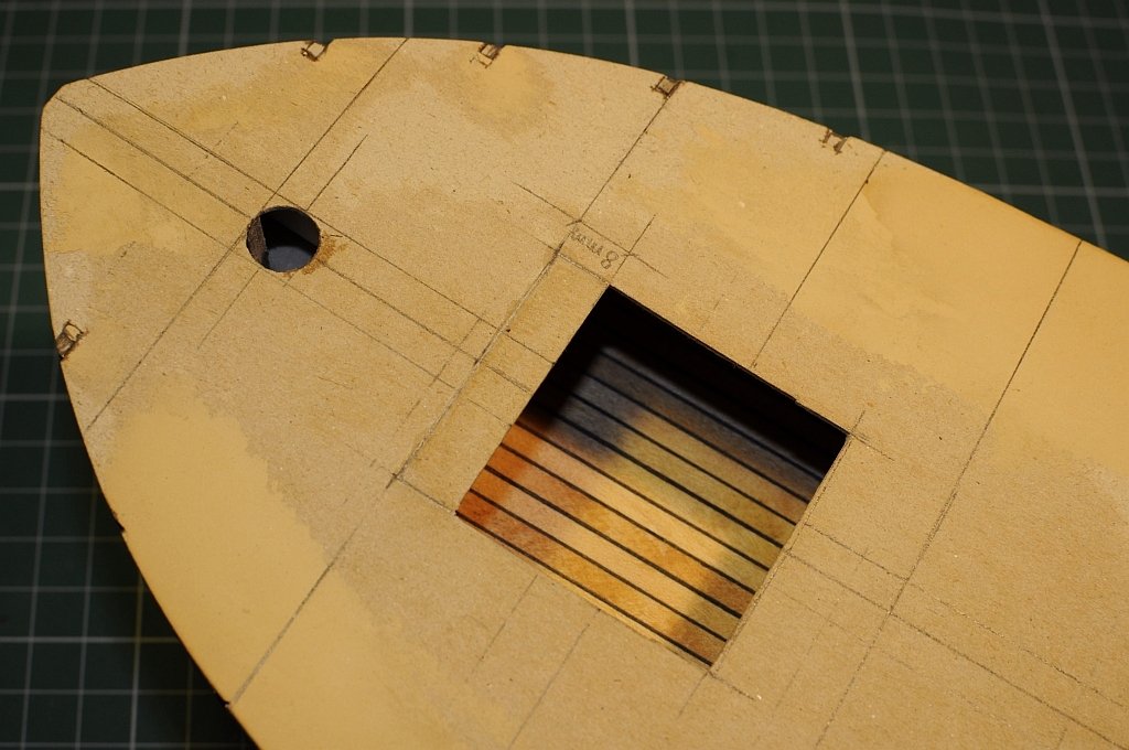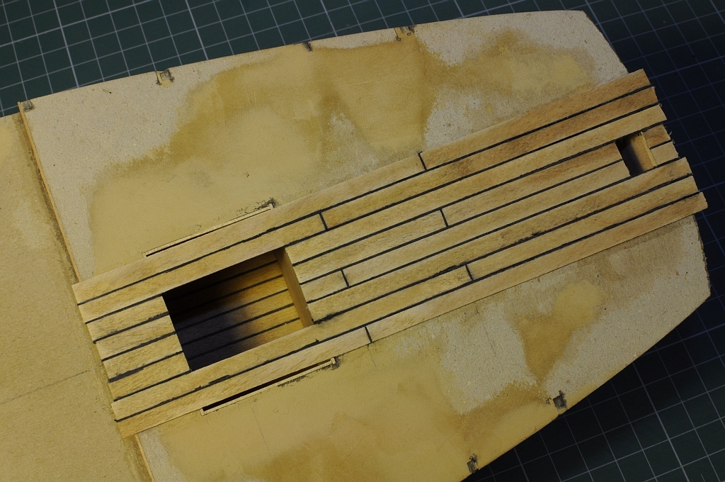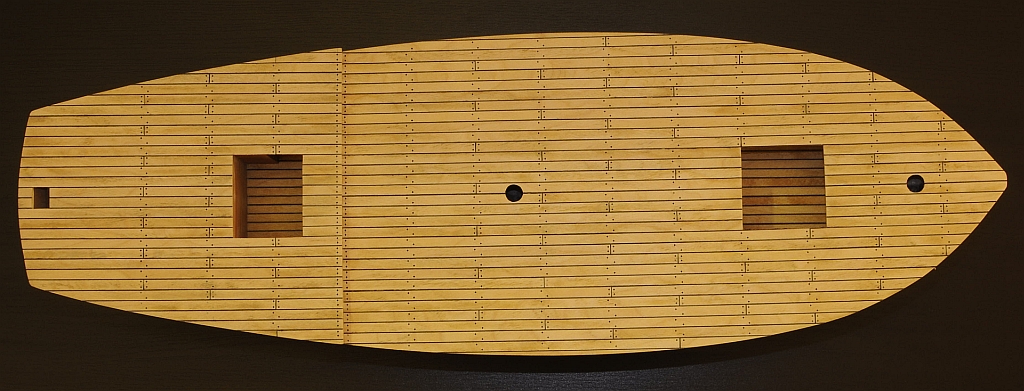 Rozpocząłem deskowanie pokładu fornirem (fornir brzozowy). Deseczki szer. 4 mm z wklejonym czarnym kartonem 0,2 mm. Układ deskowania zgodny z planami Shipyard.