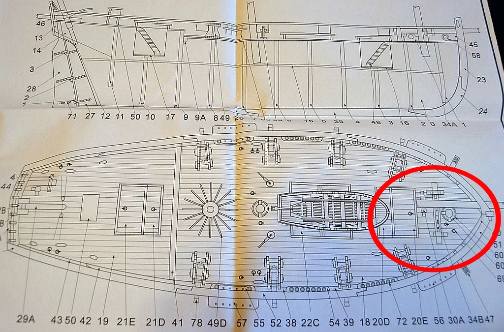 Moim założeniem przy budowie Le Coureura jest trzymanie się planów Shipyarda. Ale … Oryginalne plany są w skali 1:96 i wydawnictwo zastosowało wiele uproszczeń. Mój model został powiększony dwukrotnie i w związku z tym pozwolę sobie na małe zmiany i uzupełnienia. Pierwszym uzupełnieniem będzie dodanie istotnego elementu, jakim jest winda kotwiczna a to pociąga za sobą konieczność przeniesienia włazu. Zastosowane wcześniej przeze mnie powiększenie ładowni pozwoliło mi na przesunięcie włazu o 8 mm w kierunku rufy i wygospodarowanie miejsca na windę kotwiczną.